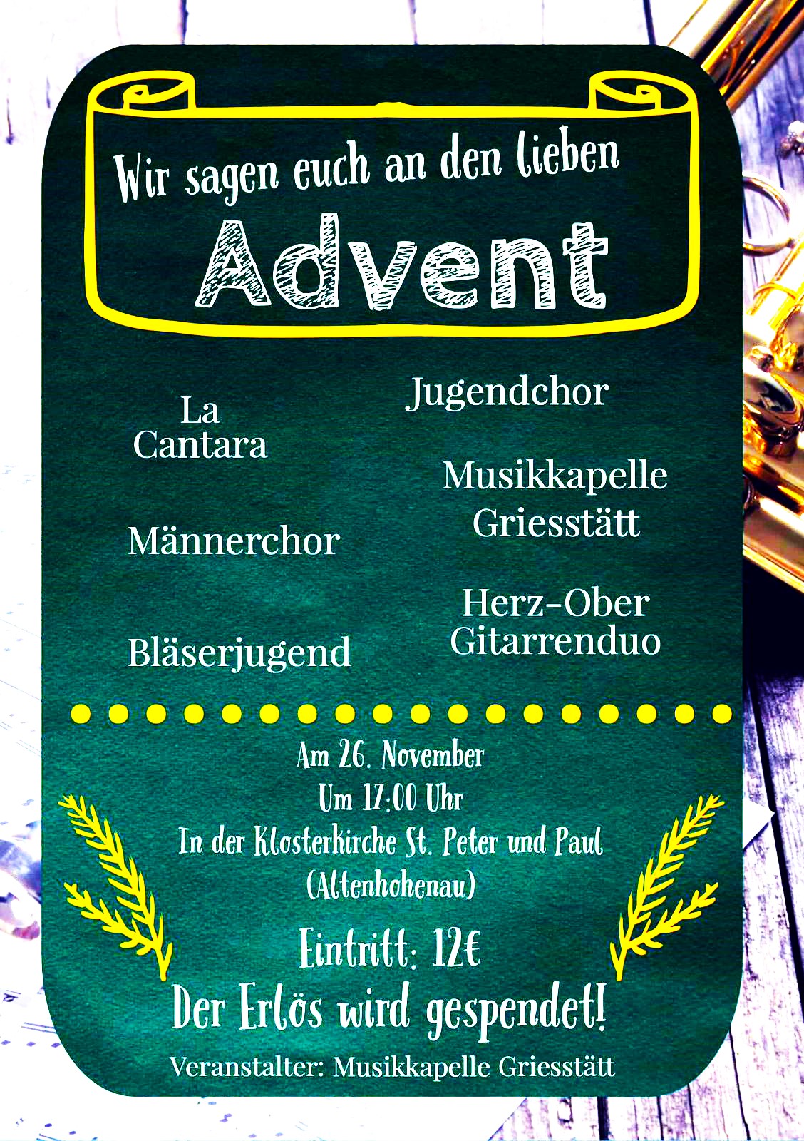 Die staade Zeit wird eingeläutet von der Musikkapelle Griesstätt mit einem Benefizabend: Am Sonntag, 26. November, findet um 17 Uhr in der Klosterkirche St. Peter und Paul in Altenhohenau ein Konzert der Musikkapelle unter dem Motto „Wir sagen euch an den lieben Advent“ statt.
