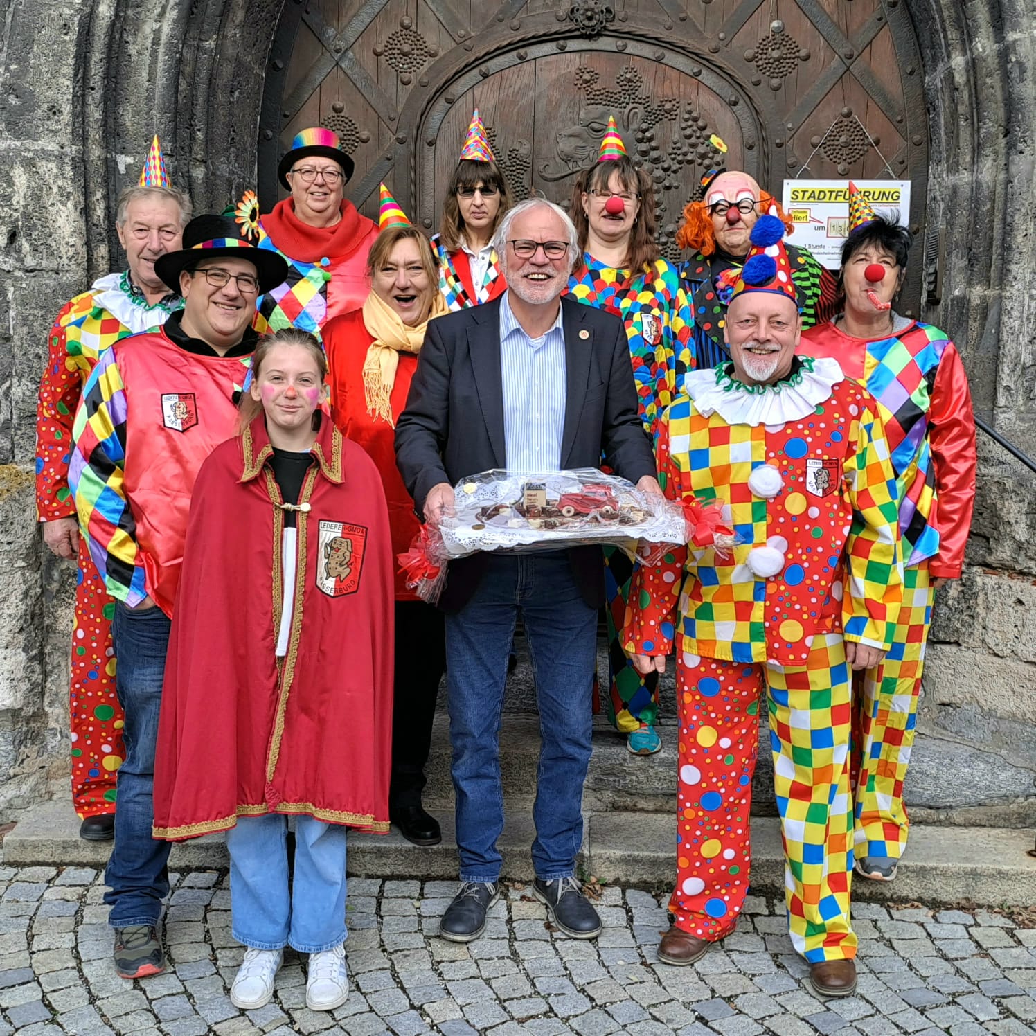 Faschingsauftakt der Lederer-Gmoa im Wasserburger Rathaus: Zweiter Bürgermeister Werner Gartner empfing gestern traditionell zum 11.11. die Narren und wünschte einen erfolgreichen Fasching 2023/2024. Die Lederer-Gmoa um Robert Stegmaier (rechts) hatte ein kleines Präsent mit im Gepäck. Nachdem die Gartners kürzlich ein E-Auto bekommen haben, das aber meistens von der Frau des Zweiten Bürgermeisters genutzt wird, bekam Werner Gartner ein eigens E-Auto überreicht – aus Schokolade. Nach dem Empfang im Rathaus ging’s zum gemeinsamen Weißwurstfrühschoppen.