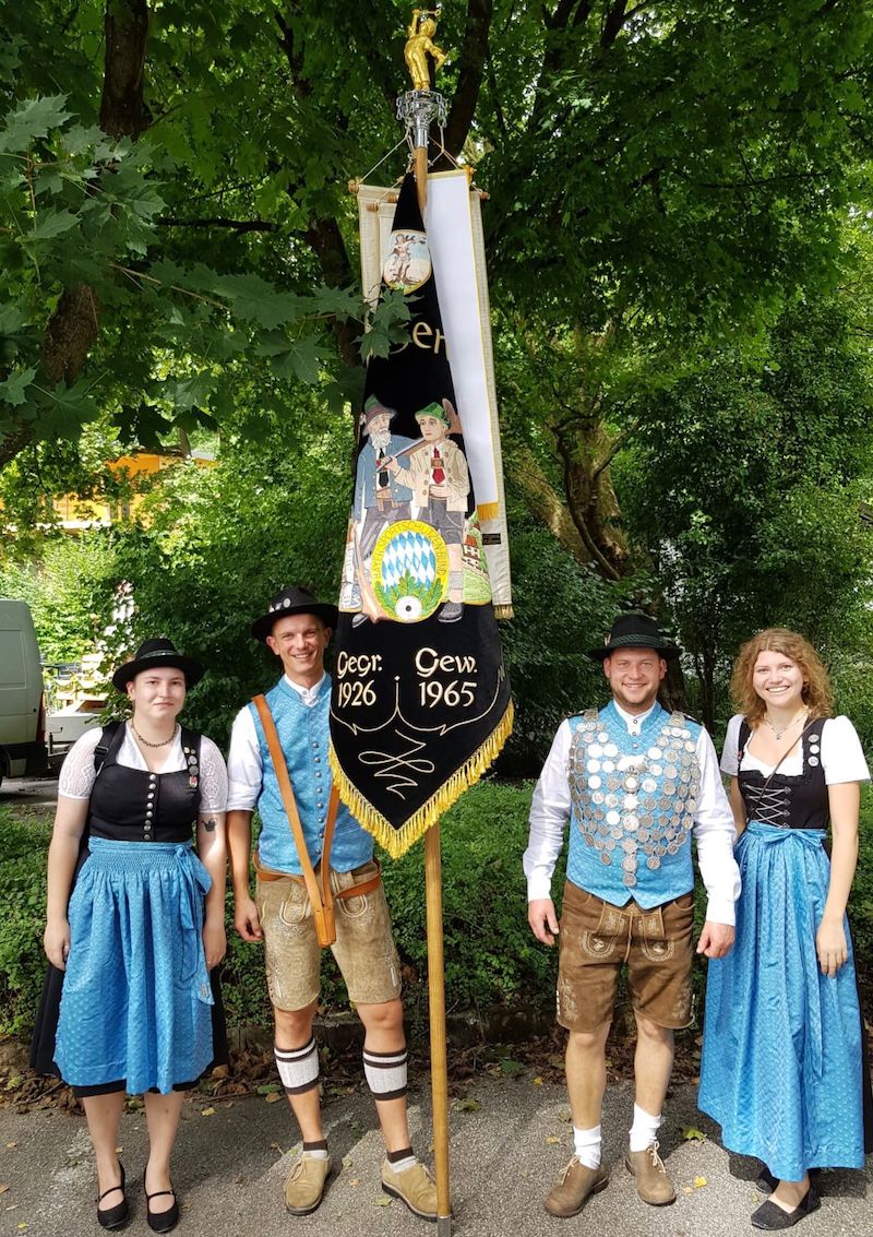Der Gaukönig 2023 Hans Kneißl mit der Fahnenabordnung von dem Gau Wasserburg-Haag: Von links: Catharina Zühlsdorf, Korbinian Schefthaler, Hans Kneißl und Kathrin Hundhammer.