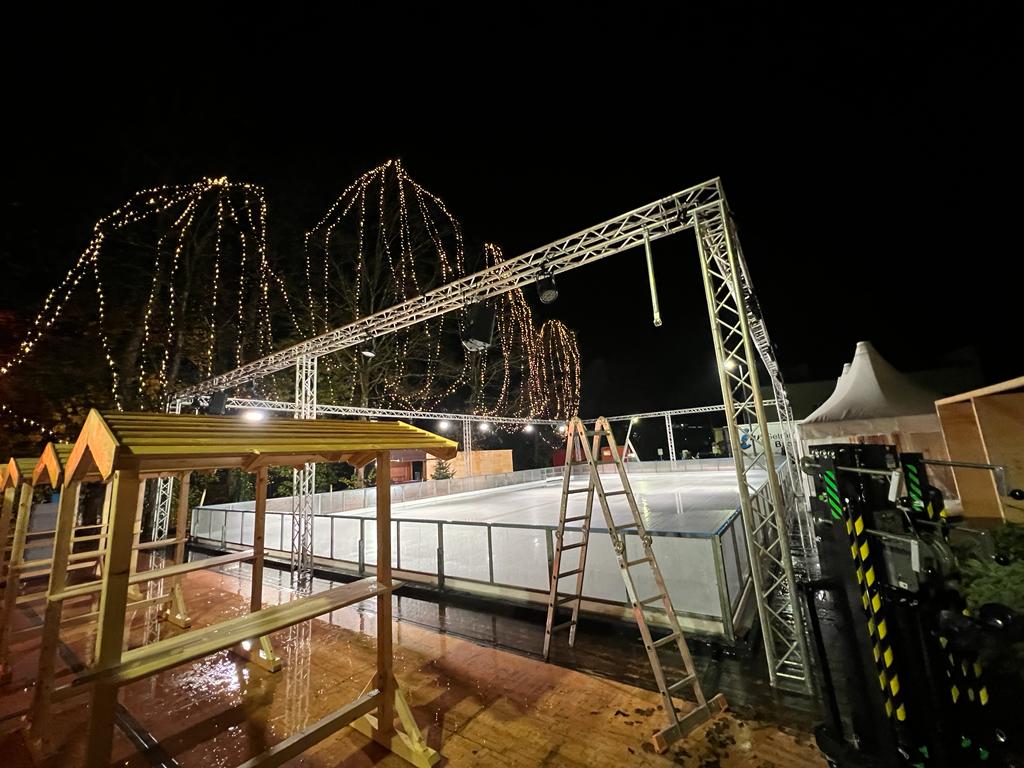 Samstag, 17 Uhr, ab auf die Eisbahn! Bürgermeister Michael Kölbl, Vertreter des WFV sowie von SAS-Veranstaltungen eröffnen morgen die Sparkassen-Eislaufarena am Gries. Noch sind die allerletzten Vorbereitungen nicht ganz abgeschlossen, vom Eiszauber und Lichterglanz konnte man sich aber gestern Abend schon ein erstes Bild machen. Eislauf auf der größten Natureisbahn zwischen München und Salzburg ist dann täglich ab 14 Uhr möglich. Fotos: WS