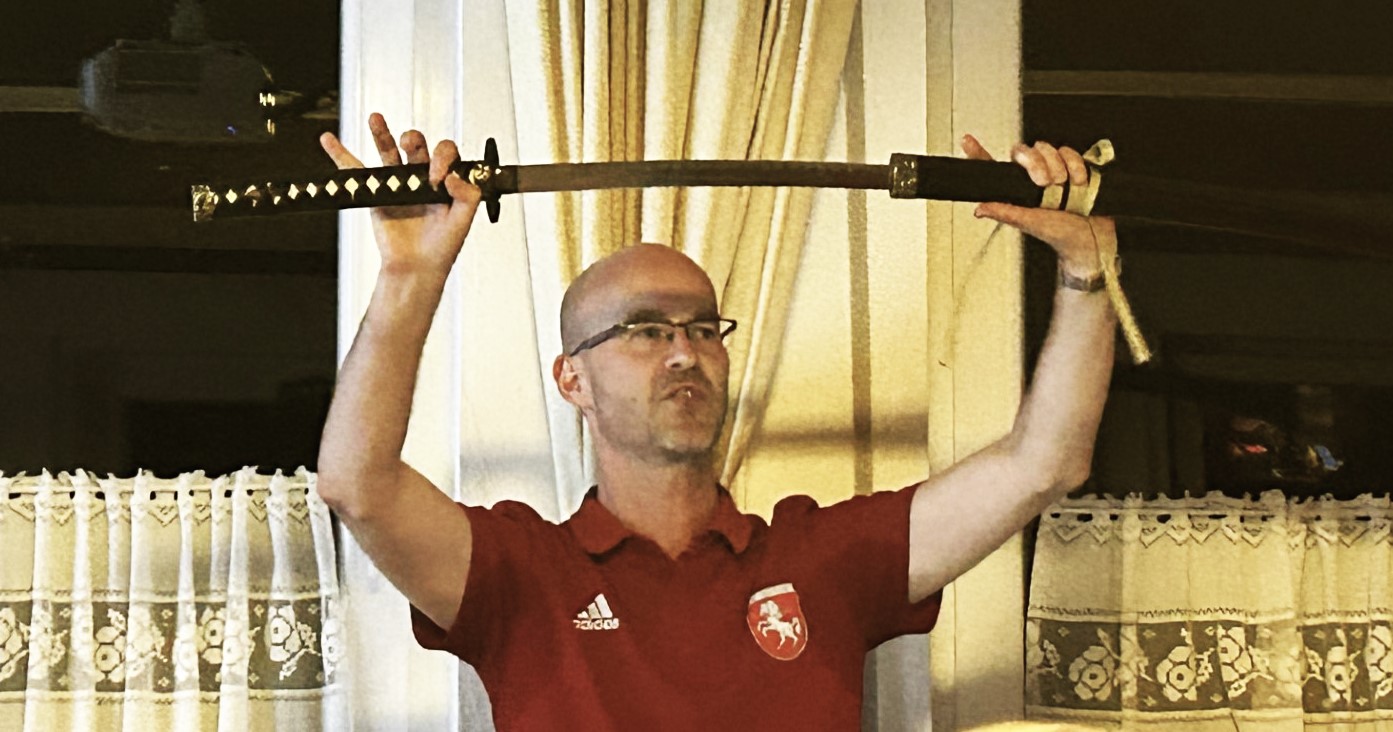 Außerdem, so wie der Herr auf dem Bild das Katana zieht, ist das absolut falsch – so fasst man ein Katana nicht an und das Schwertband passt auch nicht.