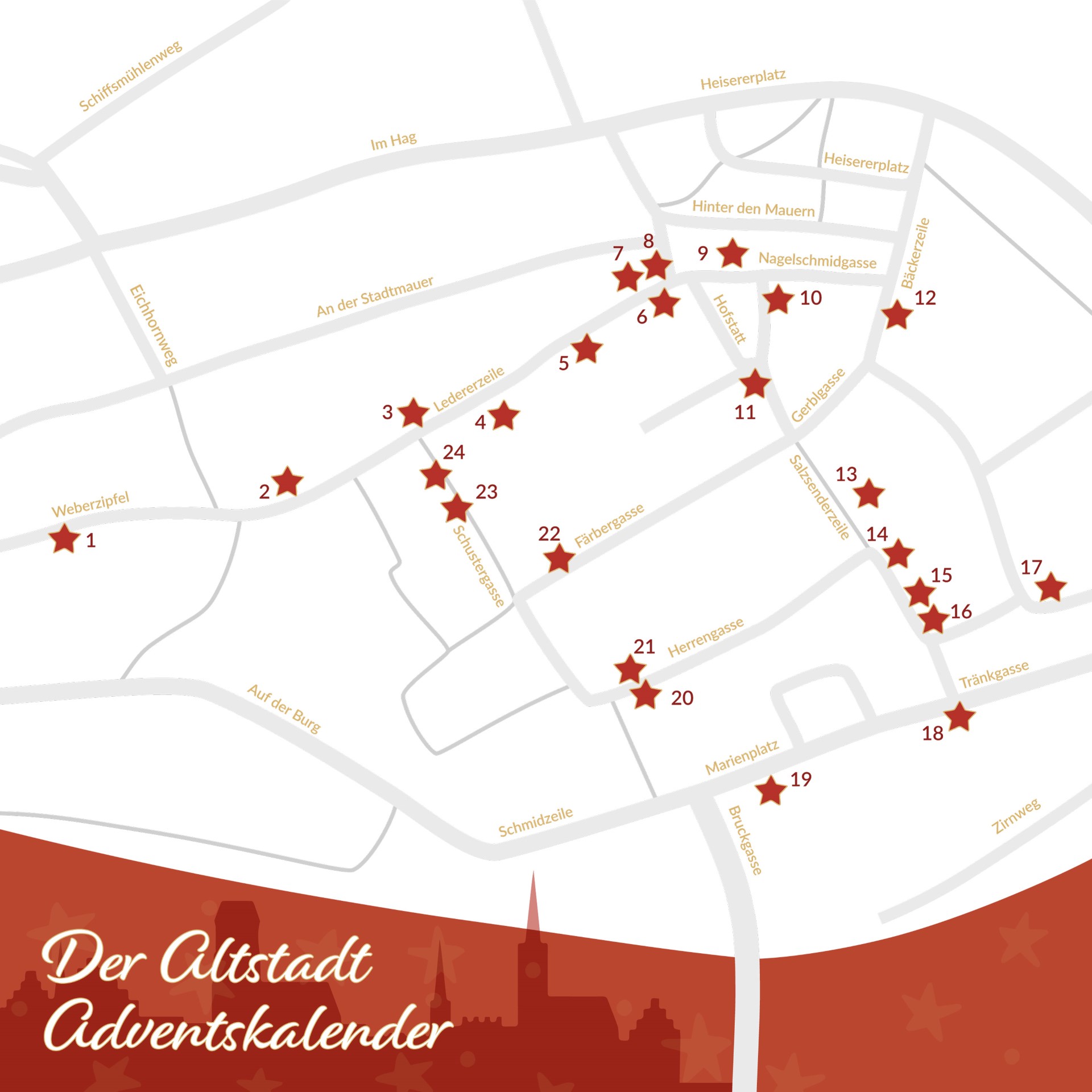 An 24 Geschäften in der Altstadt hängen ab 1. Dezember Stern-Aufkleber mit je einer Zahl (symbolisch für das „Türchen“) und je einem Buchstaben für ein Lösungswort. Die Stern-Aufkleber sind gut sichtbar an Eingangstür, Schaufenster oder an einem anderen prominenten Ort platziert.