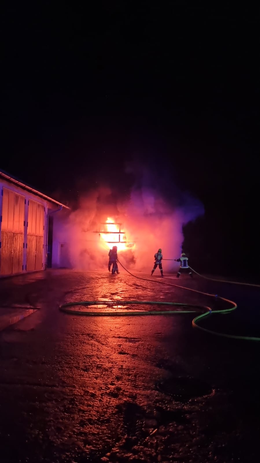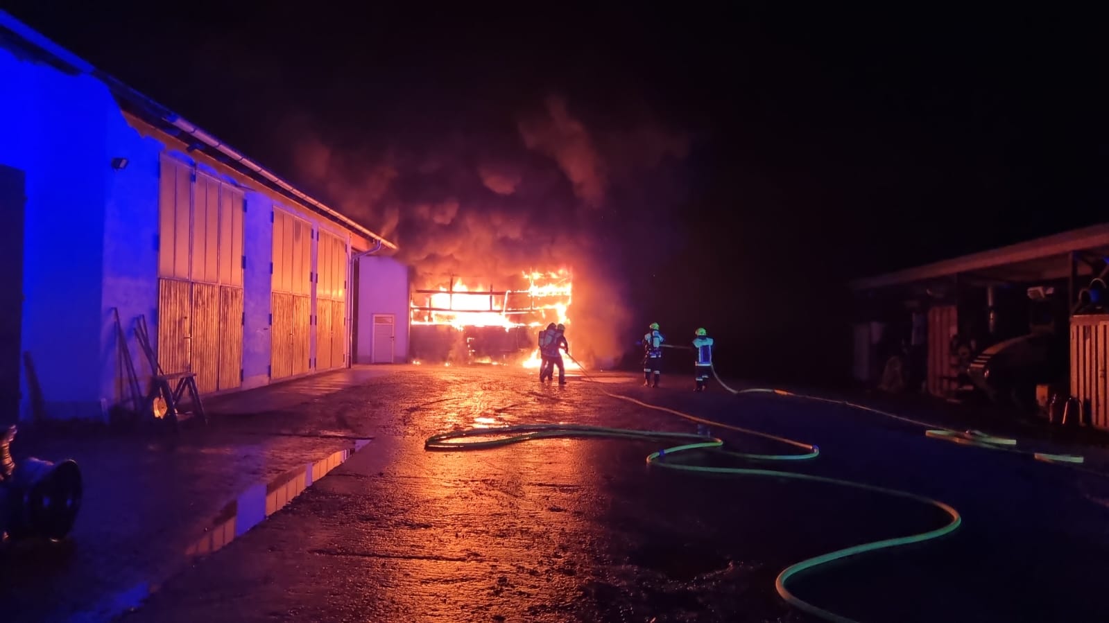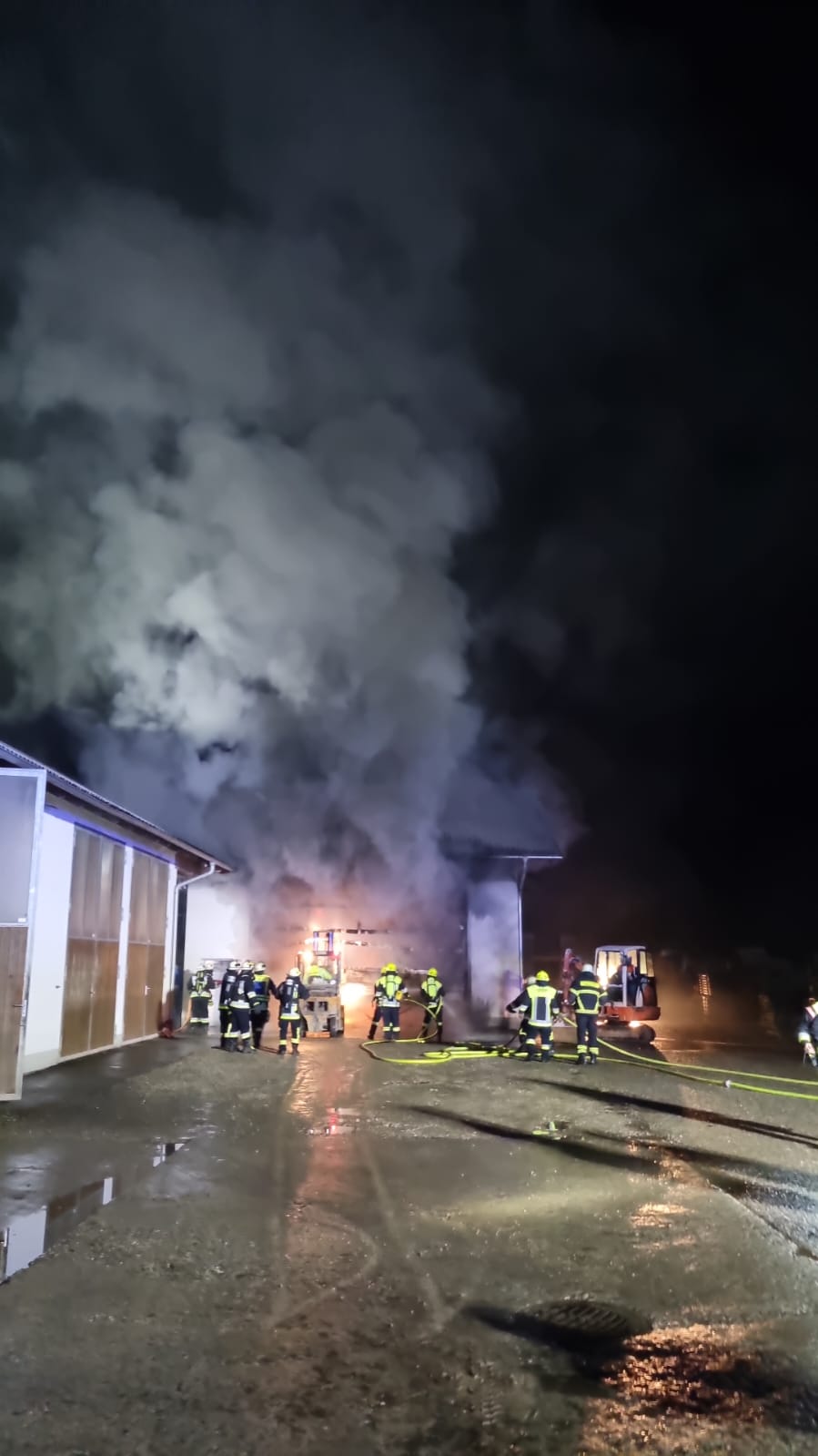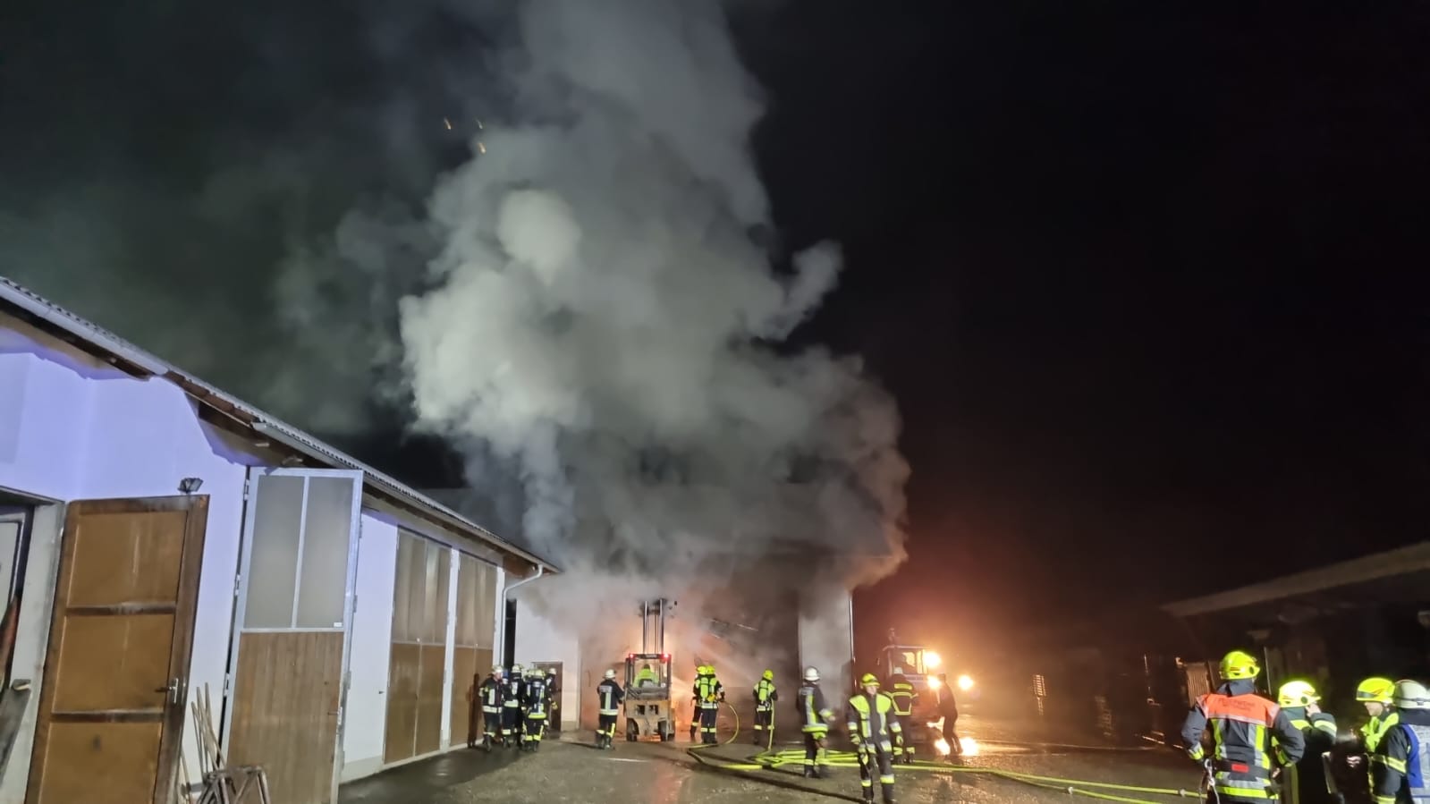 Alarm für die Feuerwehren rund um Gars: Gegen 22.45 Uhr rückten die Floriansjünger zum Weiler Hochstraß aus. Dort steht eine Lagerhalle in Flammen. Im Einsatz sind die Wehren aus Grünthal, Gars, Mittergars, St. Erasmus, Mössling und Babensham. Zahlreiche Atemschutz-Träger bekämpfen die Flammen. In der Halle befinden sich mehrere Lastwagen. Glück im Unglück: Aktuell gibt es keine Verletzten, heißt es von den Einsatzkräften. Gegen 23 Uhr wurde die Feuerwehr Waldkraiburg mit ihrer Drehleiter nachalarmiert. Allerdings: Das Feuer scheint unter Kontrolle. Fotos: RM