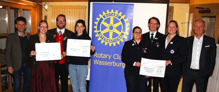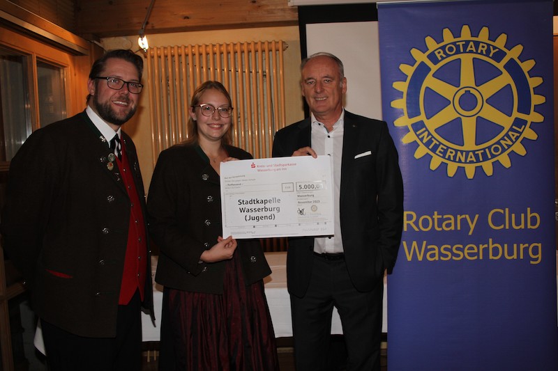 Dies war auch dem einfachen Kopfrechnen geschuldet, wie RC-Präsident Christian Beilcke, schmunzelnd anmerkte, da der Betrag in Tranchen a 5.000 Euro an drei Organisationen verteilt wird: Als Vertreter der Jugendstadtkapelle Wasserburg zeigten sich Markus Obergehrer und Lea Krötzinger überaus dankbar für die Unterstützung, die für verschiedene anstehende Projekte Verwendung finden wird. Beide versprachen als Dankeschön ein kleines Standkonzert bei der anstehenden Mitglieder Weihnachtsfeier des RC Wasserburg.