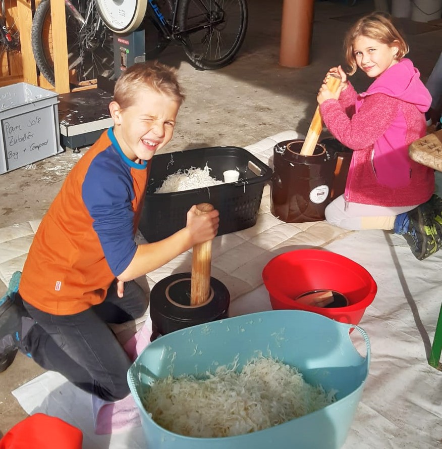 Am Kirchweih-Mittwoch stand dann das alljährliches Kraut-Einmachen auf dem Programm. Über 180 kg Kraut wurden von 16 Personen bestellt und gemeinsam am Nachmittag in verschiedene Gärgefäße gestampft. Das Kraut gab‘s schon geschnitten beim Landhandel Kapsner in Hochstätt. Egal, ob Kinder oder Erwachsene, alle hatten viel Spaß beim Stampfen.