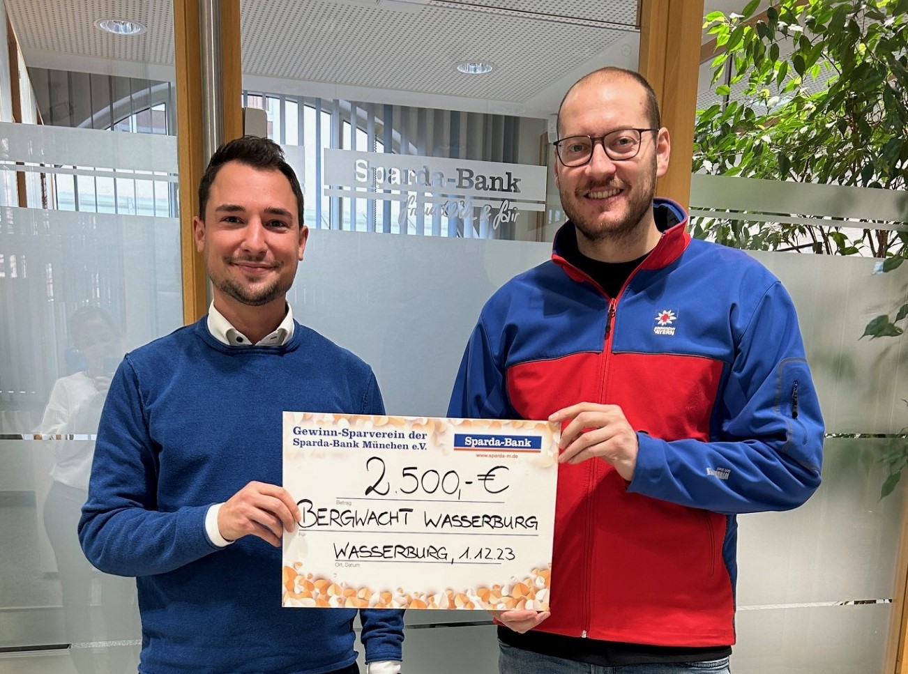 Das Foto zeigt links Moritz Kammermeier, Vermögensberater der Sparda-Bank in Wasserburg und Florian Zwingler, stellvertretender Bereitschaftsleiter der Bergwacht Wasserburg, bei der Scheck-Übergabe.