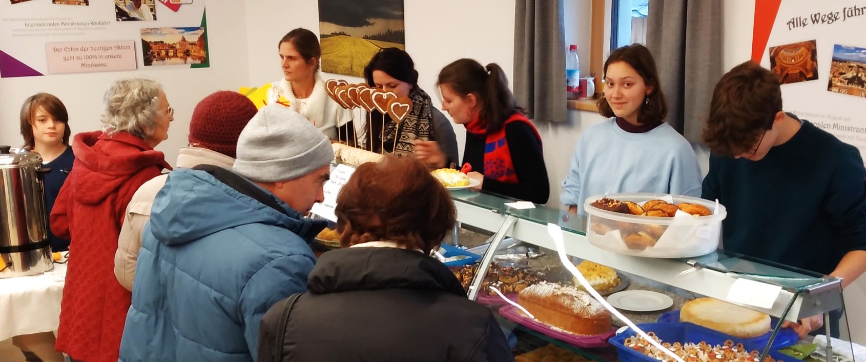 Durch die Rotter Jugendkapelle musikalisch auf die Vorweihnachtszeit eingestimmt, wurden regional selbstgemachte Produkte an über 30 Verkaufsständen angeboten und die Gäste mit Kulinarik verwöhnt. Viele trotzten der Witterung an den zahlreichen Unterständen – andere suchten die wohlige Umgebung im Gemeindehaus, um sich zum Klang der Emmeringer Saitenmusi am Kaffee- und Kuchenstand (Foto unten) zu stärken.