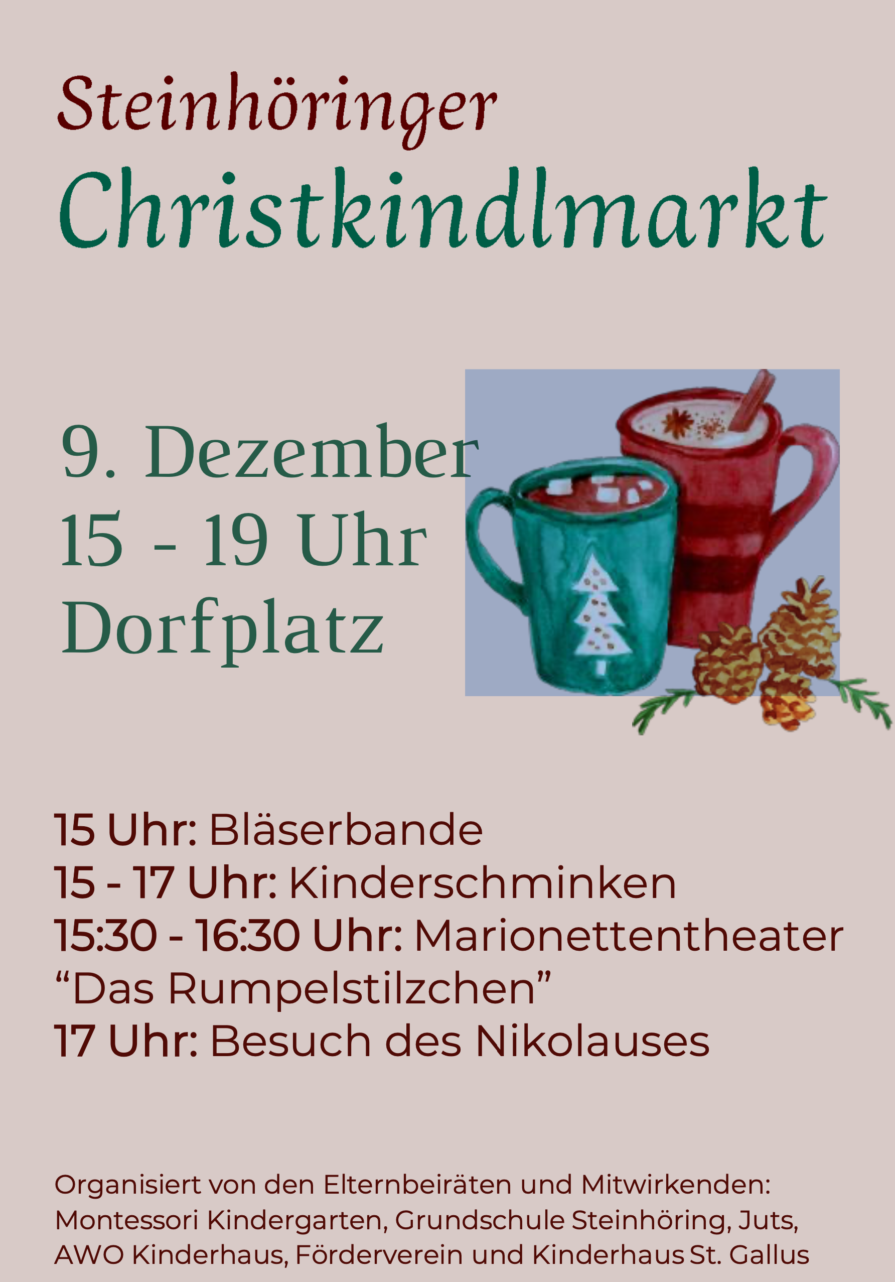 Organisiert wird der Christkindlmarkt von den Elternbeiräten und Mitwirkenden des Montessori Kindergartens, der Grundschule Steinhöring, dem Juts, dem AWO-Kinderhaus, dem Förderverein und dem Kinderhaus St. Gallus.