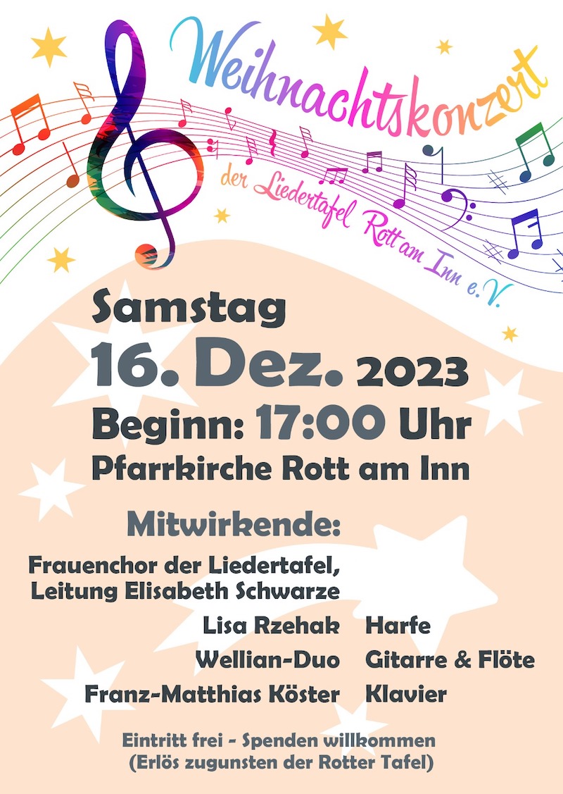 Am kommenden Samstag um 17 Uhr findet das Konzert in der Pfarrkirche Rott statt – zuhören, mitsingen und helfen: Der Eintritt ist frei – Spenden sind aber sehr willkommen, denn der Erlös ist zugunsten der Rotter Tafel.