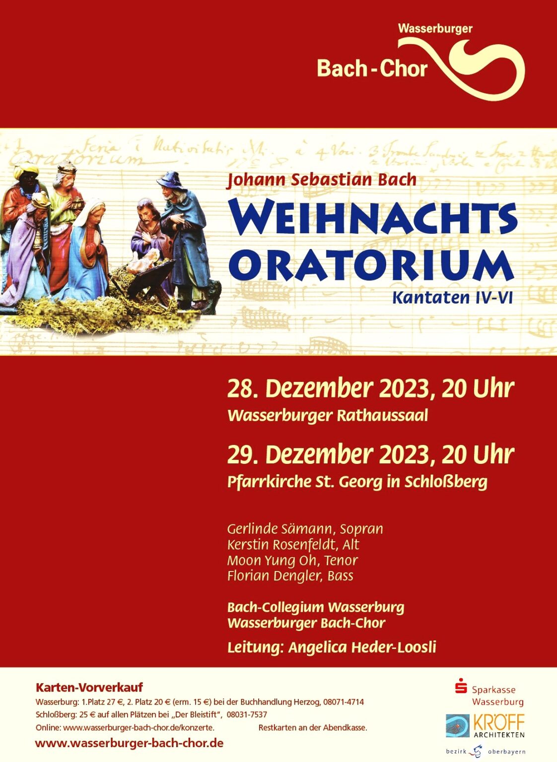 Zwei Konzerte zwischen den Jahren: Das Weihnachtsoratorium von Johann Sebastian Bach – die Kantaten IV bis VI – gibt es am Donnerstag, 28. Dezember, im Wasserburger Rathaussaal zu hören und am Freitag, 29. Dezember, in der Pfarrkirche St. Georg in Schloßberg. Es laden herzlichst ein: Es singt der Wasserburger Bach-Chor, begleitet vom Bach-Collegium Wasserburg mit der Konzertmeisterin Marija Hackl. Die Leitung hat Angelica Heder-Loosli.