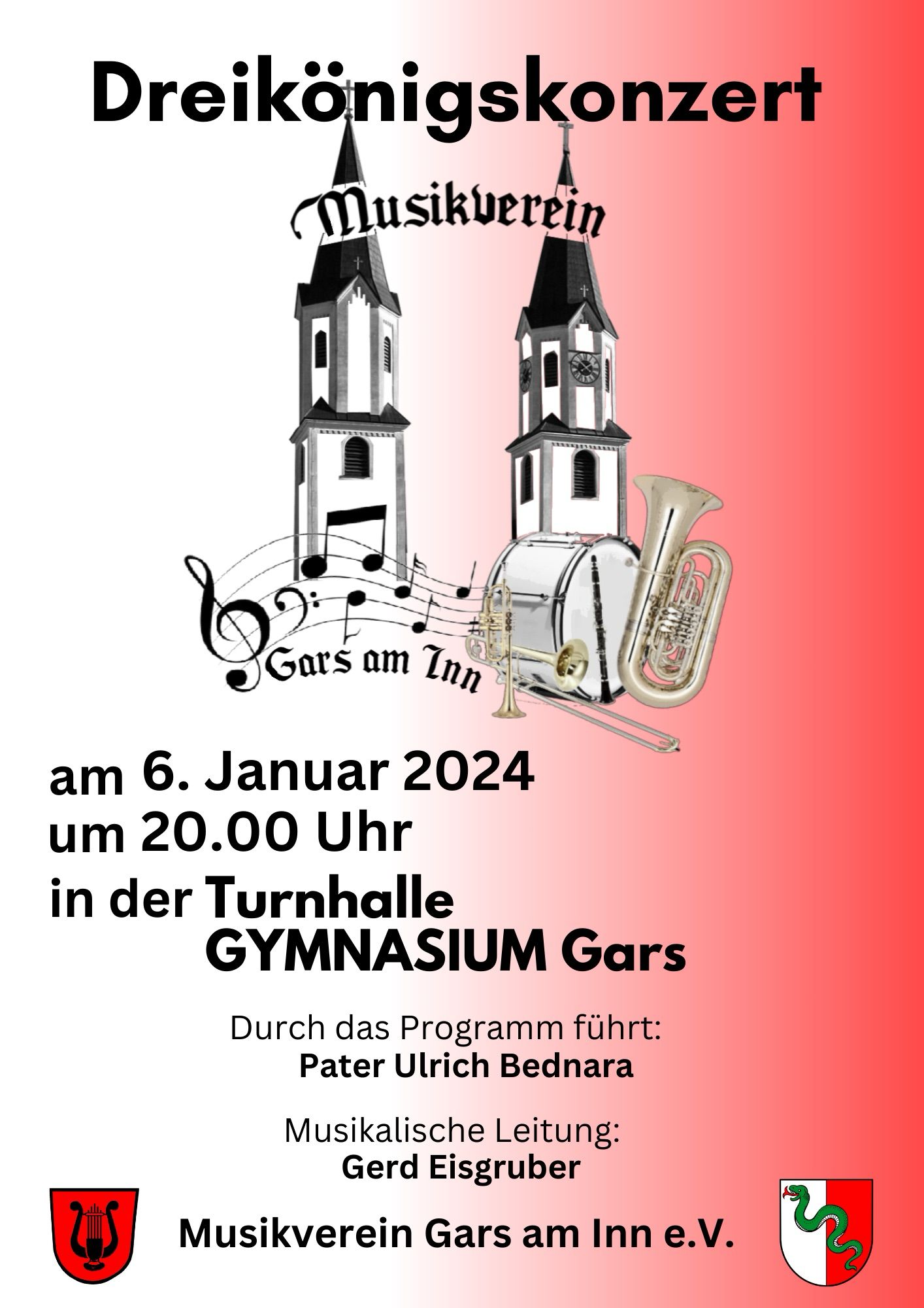 Der Musikverein Gars am Inn e.V. unter der Leitung von Gerd Eisgruber lädt herzlkichst ein: Zum Abschluss der weihnachtlichen Zeit findet wieder das traditionelle Dreikönigs-Konzert des Musikvereins statt. Diesmal – wegen Sanierungsarbeiten – am Samstag, 6. Januar, in der Turnhalle des Gymnasiums in Gars.