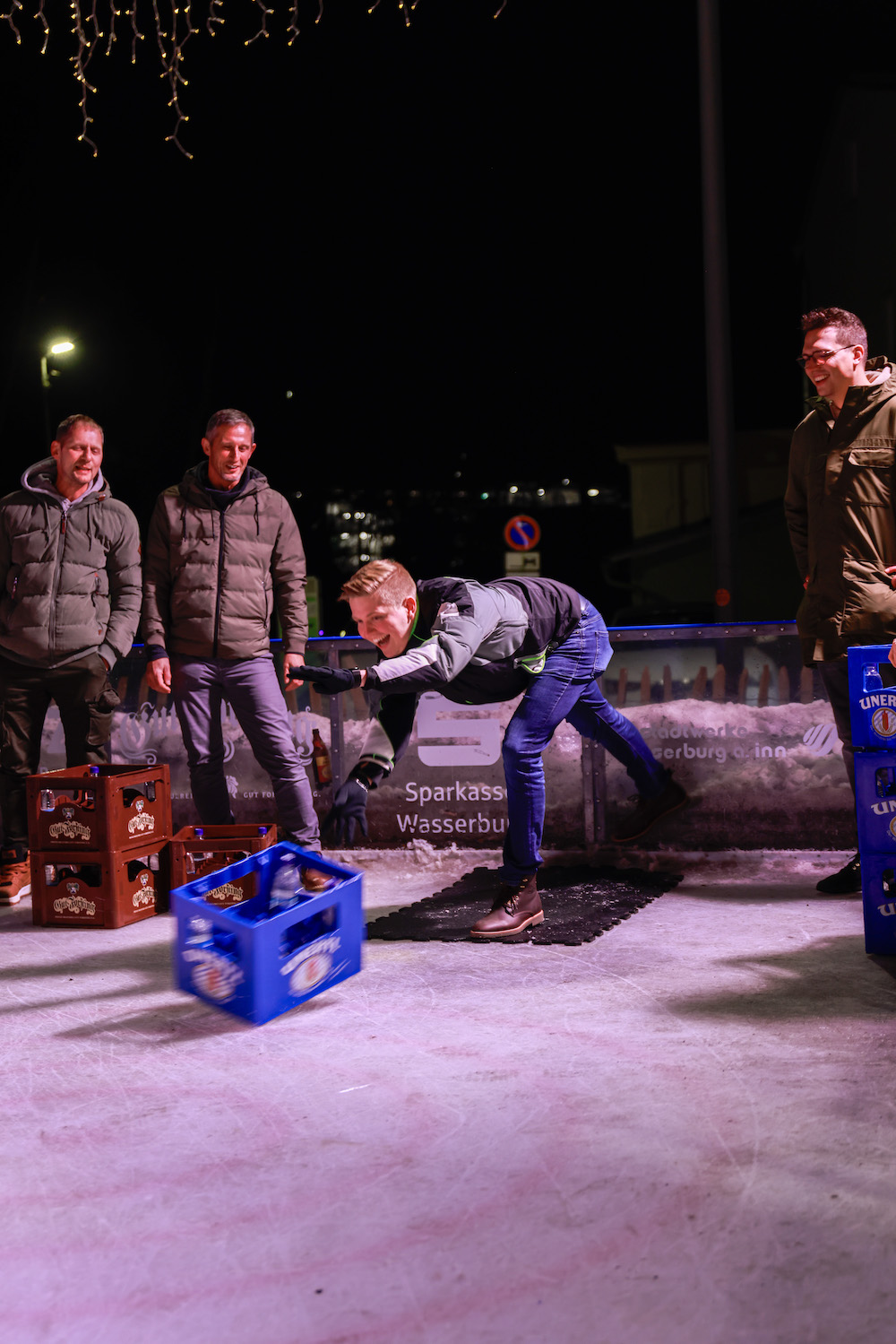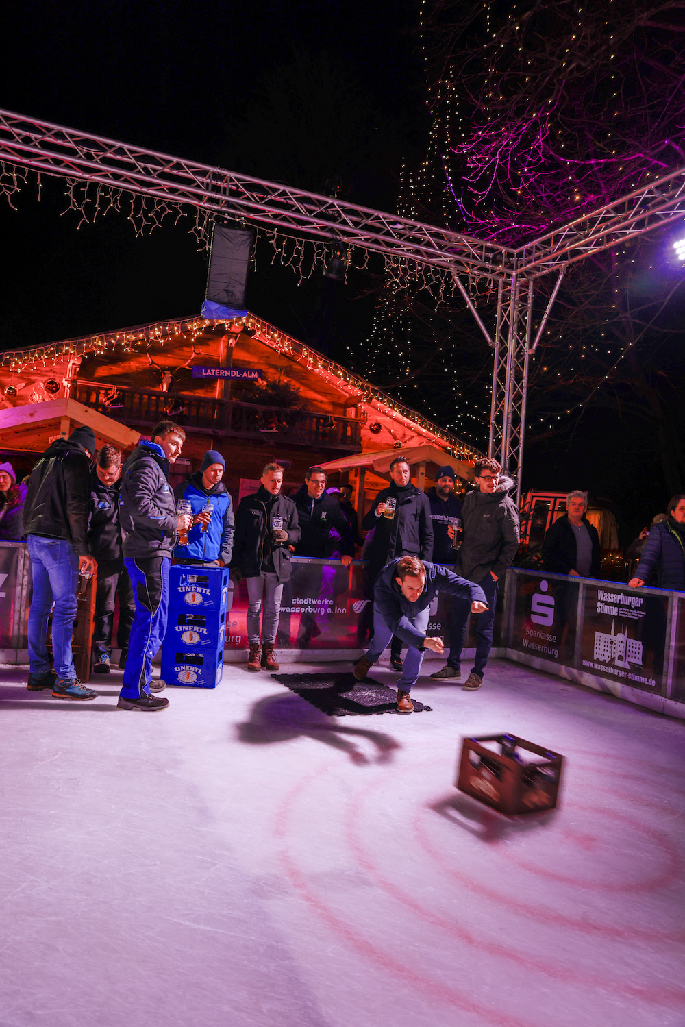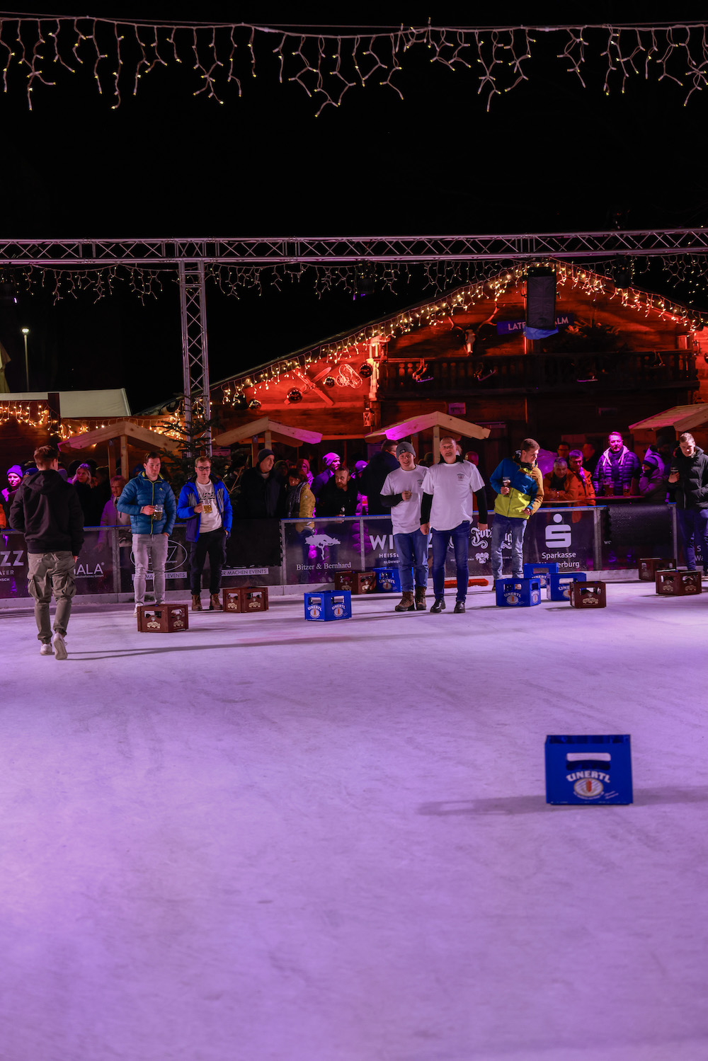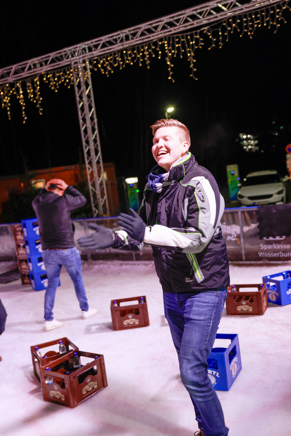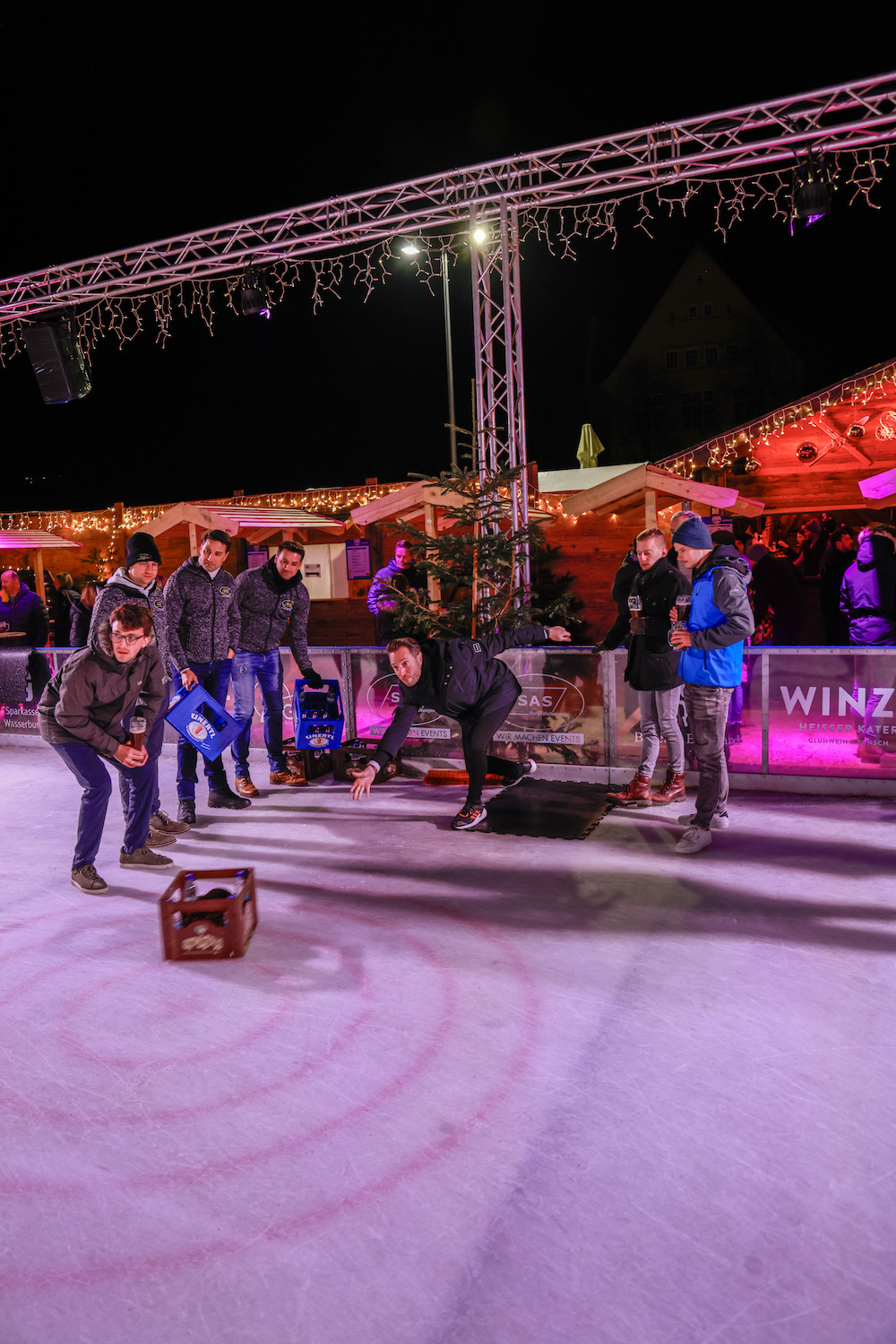 20 Teams gestern beim Bierkasten-Curling in der Sparkassen-Eislauf-Arena im Wettstreit