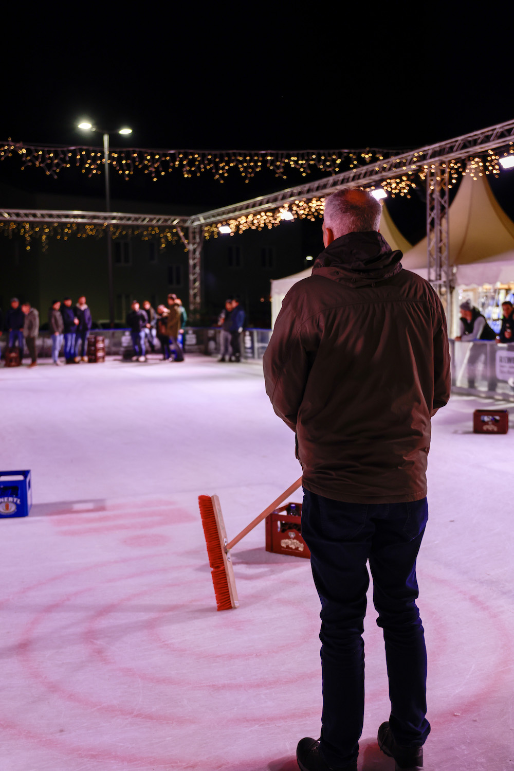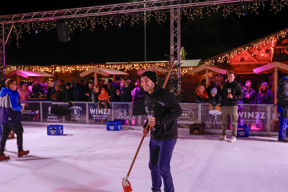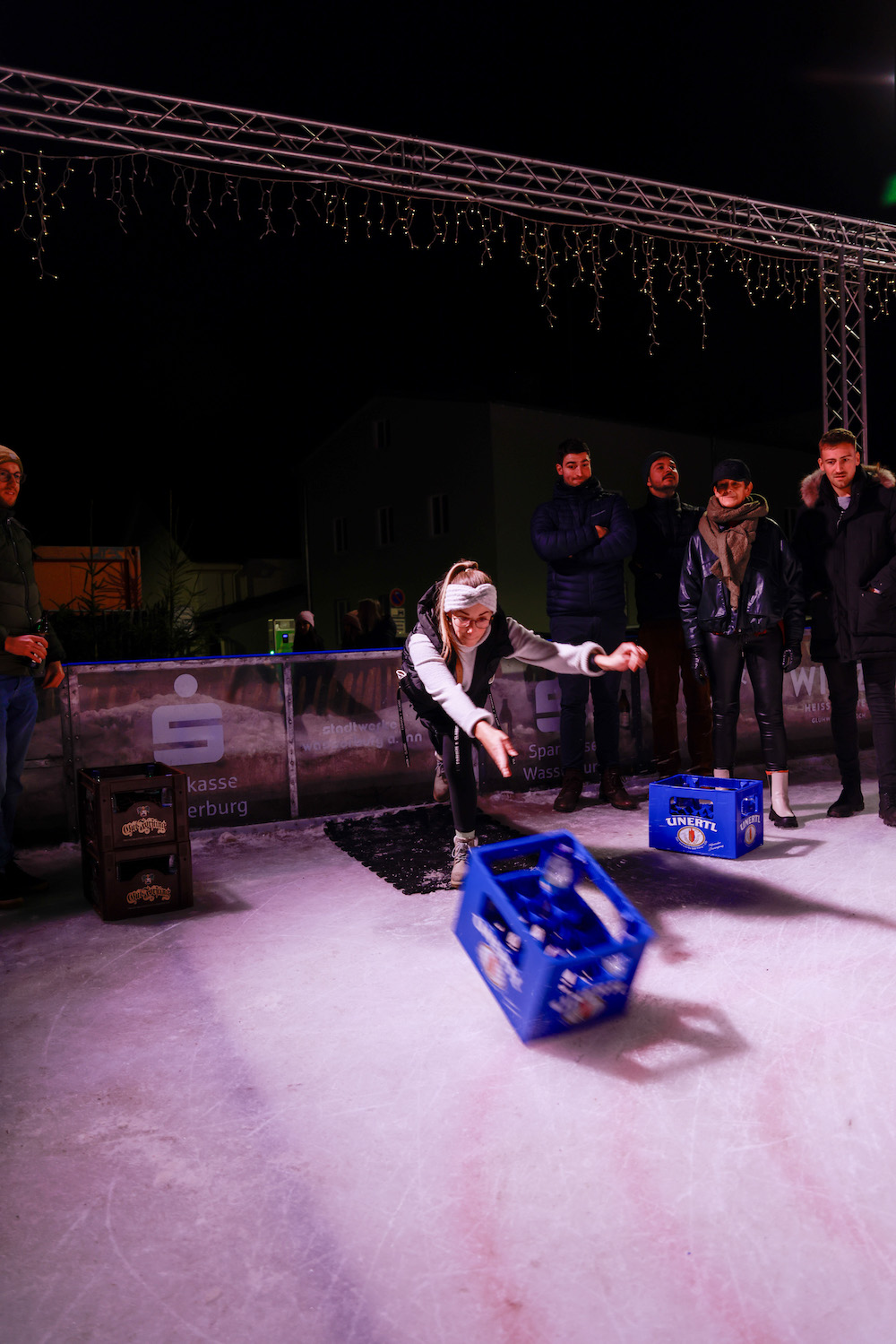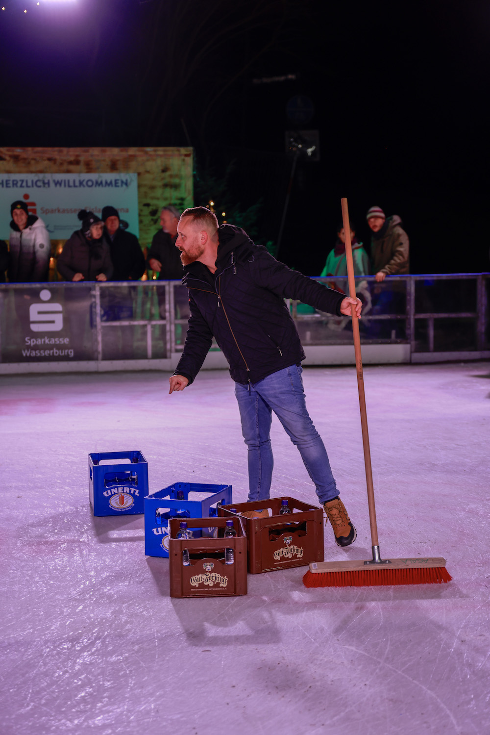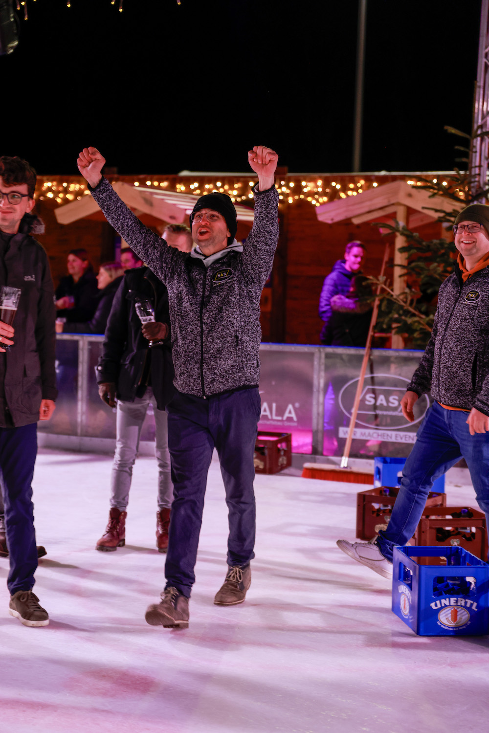 20 Teams gestern beim Bierkasten-Curling in der Sparkassen-Eislauf-Arena im Wettstreit