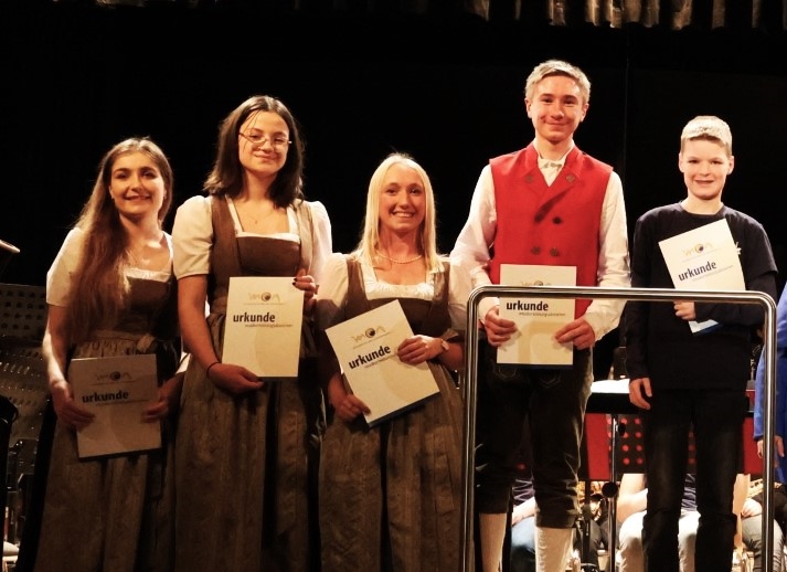 Anschließend überreichte die stellvertretende Bezirksleiterin des Musikbundes Brigitte Koch das Bronze-Abzeichen an Johannes Bauer (Schlagzeug), Josefa Eder (Klarinette), Annalena Gruber (Trompete), Lina Rapolder (Saxophon) und Jakob Reuß (Tenorhorn). Theresa Bauer auf der Trompete und Magdalena Pfeilstetter auf der Klarinette erhielten das Musikleistungsabzeichen in Silber.