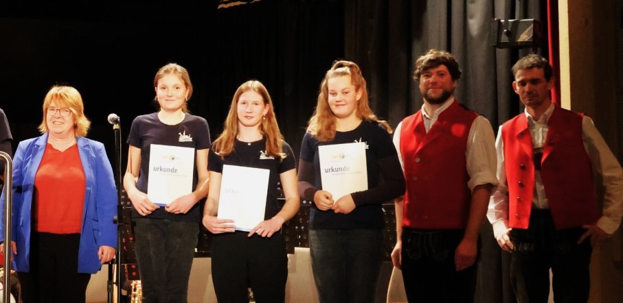 Und hier im Bild von links Brigitte Koch (stellvertretende Bezirksleiterin MON), den Geehrten Annalena Gruber, Lina Rapolder und Josefa Eder sowie Adrian Holzapfel (1. Vorstand) und Tobias Huber (Jugenddirigent).