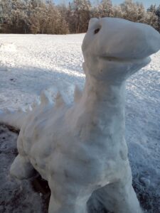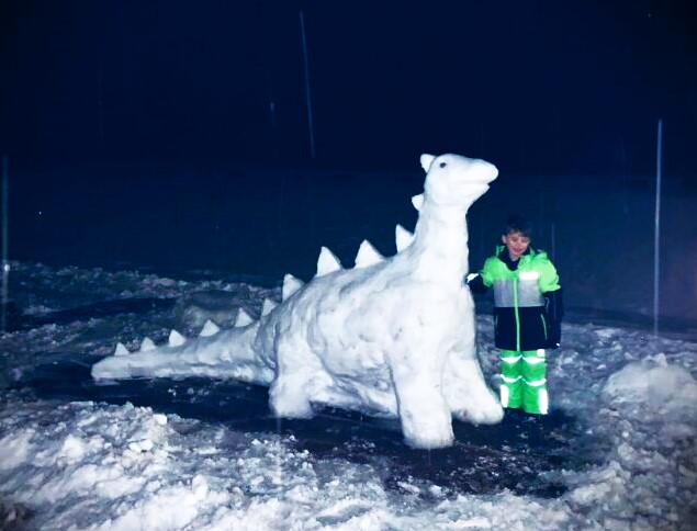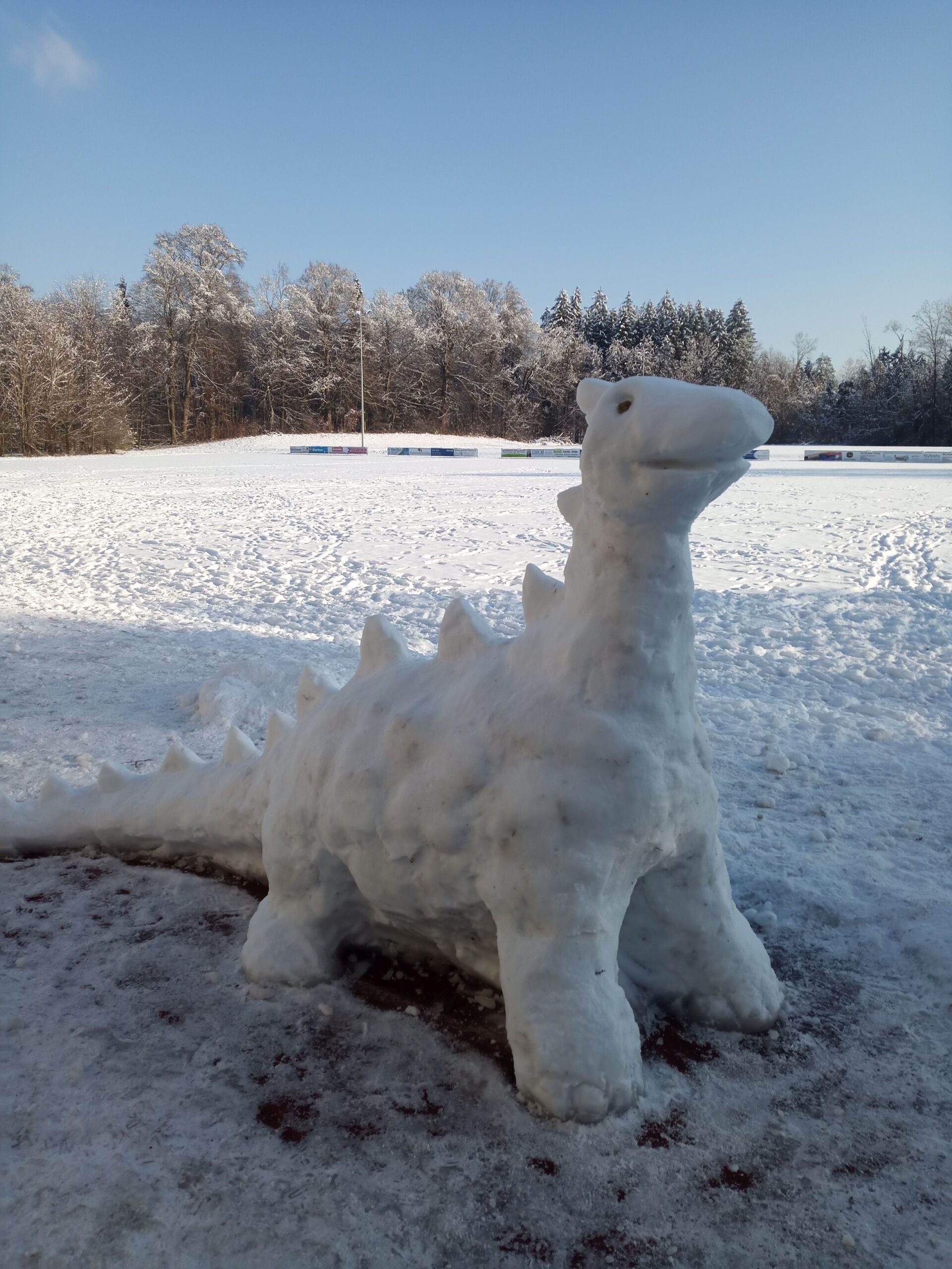 Genau zum Ende der Weihnachtsferien kam der Schnee zurück. Der sechsjährige Maxl aus Soyen nutzte den letzten Ferientag und baute zusammen mit seiner Mama einen großen Dino am Sportplatz.