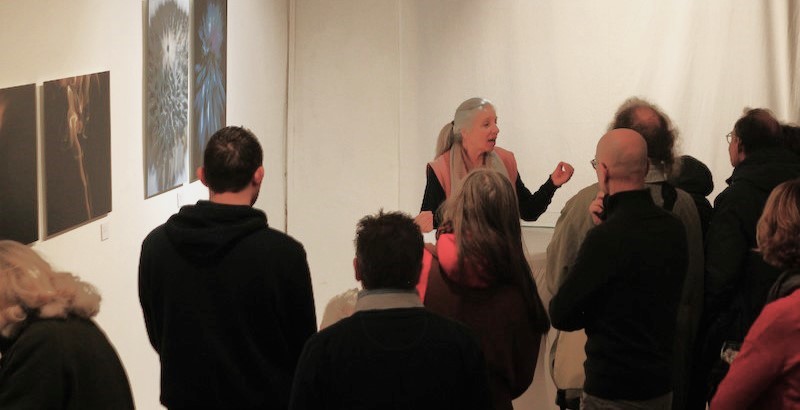 Tief beeindruckt von den Objekten, besuchte sie die Ausstellung mehrmals und teilte nun ihre Gedankengänge zu Heidi Schmidingers Kunst mit den Anwesenden. Die Künstlerin hieß ebenfalls alle herzlich willkommen und gab im Anschluss anhand einiger ausgestellter Fotografien einen exklusiven Einblick in ihr künstlerisches Wirken. In der Führung erläuterte sie ihren Weg von der analogen zur digitalen Fotografie sowie die Hintergründe und Entstehungsgeschichten ihrer Werke. So offenbarte sich den Betrachtenden ihr kreativer Schaffensprozess, aber auch der philosophische Sinn hinter ihrer Kunst. Danach gab es vielfach Gelegenheit zum gegenseitigen Austausch und für anregende Gespräche. Die gesellige Atmosphäre wurde durch die musikalische Begleitung vom Duo Frangipani untermalt.