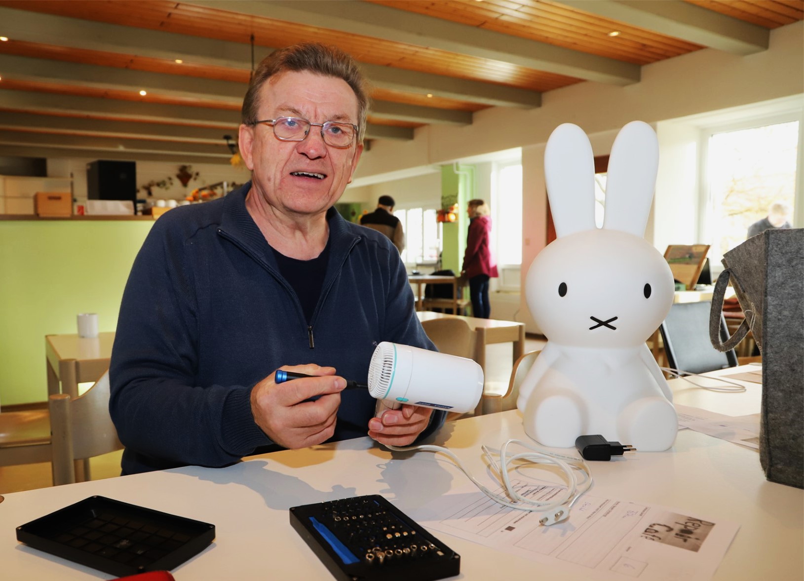 Von 14 bis 17 Uhr reparieren engagierte Bastler, Tüftler und Experten zum Beispiel Kaffeemaschinen, Musikanlagen, Haushaltsgeräte oder Spielzeug. Dafür bringen sie gängige Ersatzteile und das nötige Werkzeug mit.