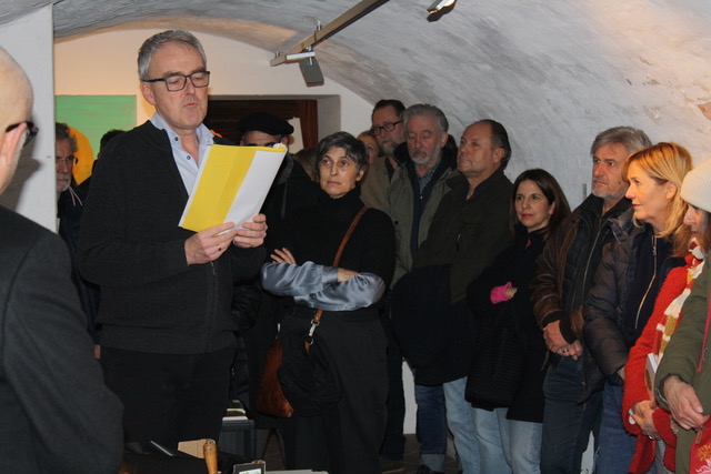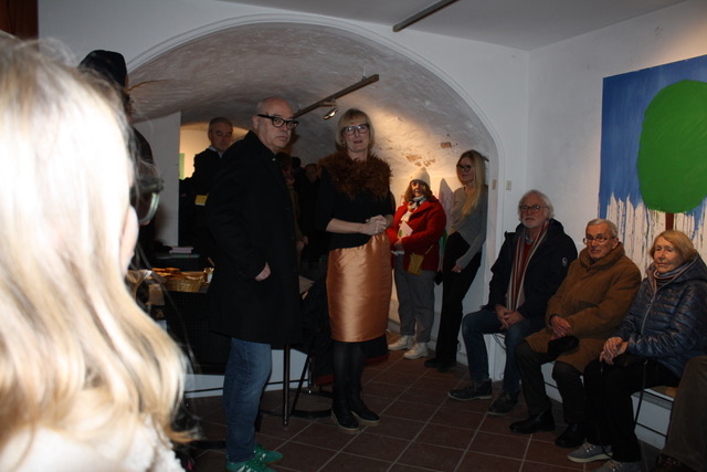In der anschließenden Einführung des Künstlers durch Dr. Matthias Meindl kamen nochmals die Programmsätze des Künstlers zur Sprache. Pytliks Bilder wollen einen seelischen Beitrag leisten, er wolle das Ganserhaus „bewalden“. Die 338 Exponate, die hier ausgestellt würden, stellten eine Einheit dar, die Werke seien gemeinsam eine „Installation“.