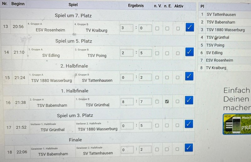 Turniersieger Tattenhausen setzte sich mit einem 2:0 im Finale gegen den TSV Babensham durch, Wasserburg gewann sein Spiel um Platz 3 gegen den TSV Grünthal mit 5:0.