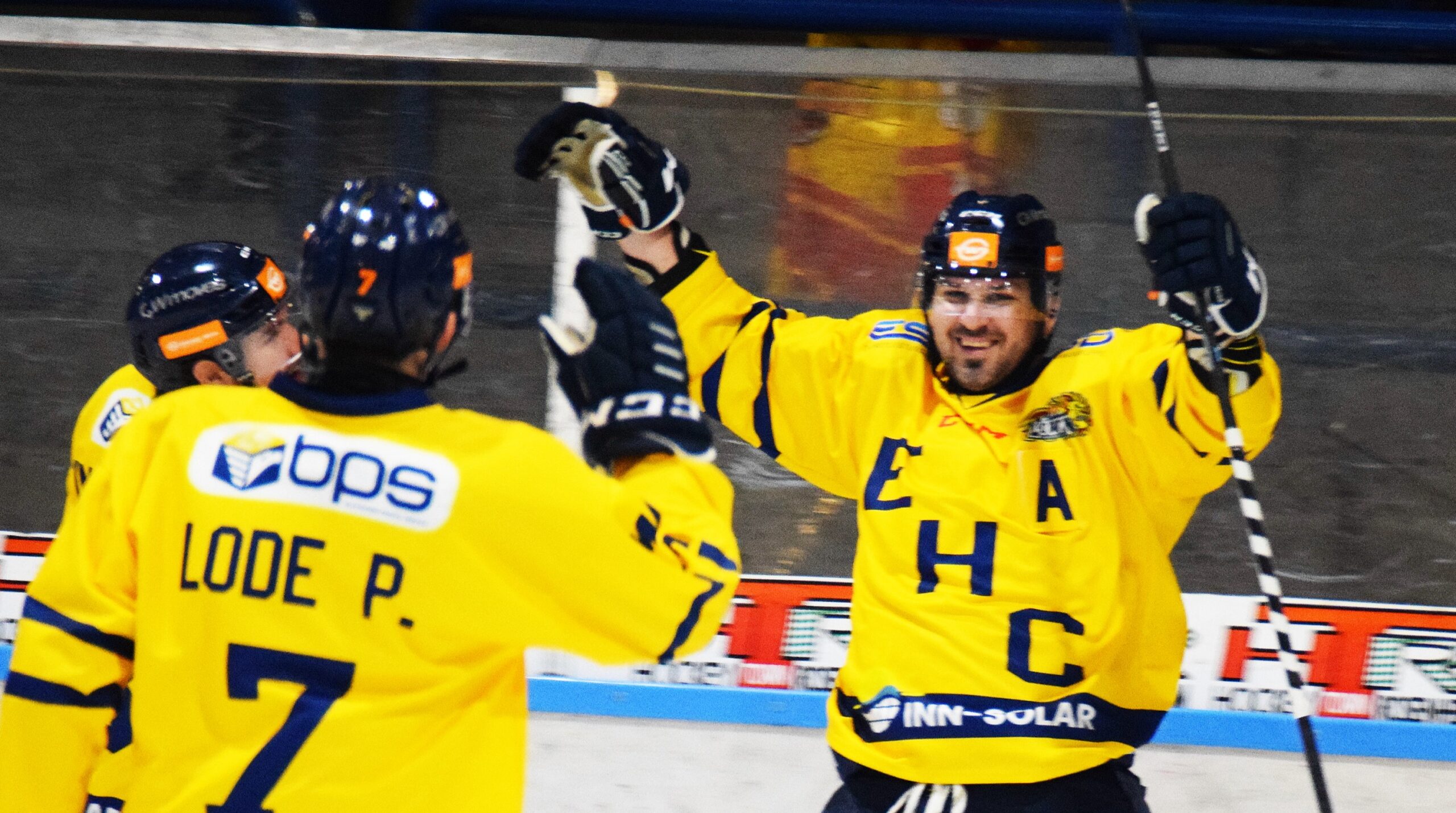 Matchwinner für die Eishockey-Löwen aus Waldkraiburg war Verteidiger Daniel Hora (rechts im Bild jubelnd). Hinten verteidigte er überragend und vorne steuerte er zwei Treffer und eine Vorlage zum Sieg bei: Am vergangenen Freitag trat der EHC bei den „Aibdogs“ aus Bad Aibling an und die machten es der angeschlagenen Truppe von Coach Jürgen Lederer wahrlich nicht leicht.