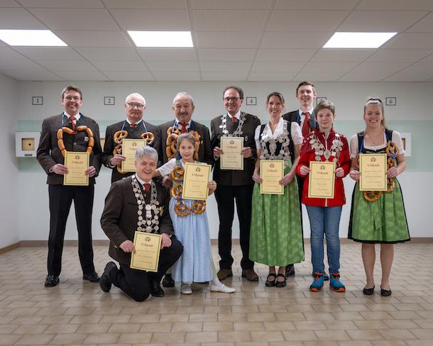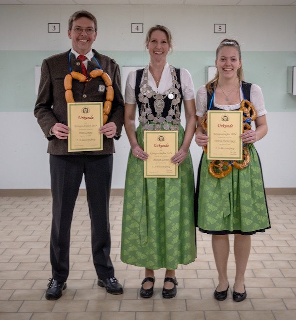 Ein Familien-Duell gab es in der allgemeinen Luftgewehrklasse. Vorjahres-König Peter Linner begnügte sich heuer mit der Würschtl-Kette. Er ließ seiner Frau Miriam den Vortritt und durfte dieser als neuer Regentin die Königskette umhängen. Wer so viele Zehner schießt wie Verena Niedermayr, der jüngst wiederholt die magische Ringzahl 100 auf 10 Schuss gelang, darf auf dem Stockerl nicht fehlen. „Des is Respekt vor dem Alter, dass du uns virelossn host!“, scherzten die beiden Linners mit der Brezenkönigin.
