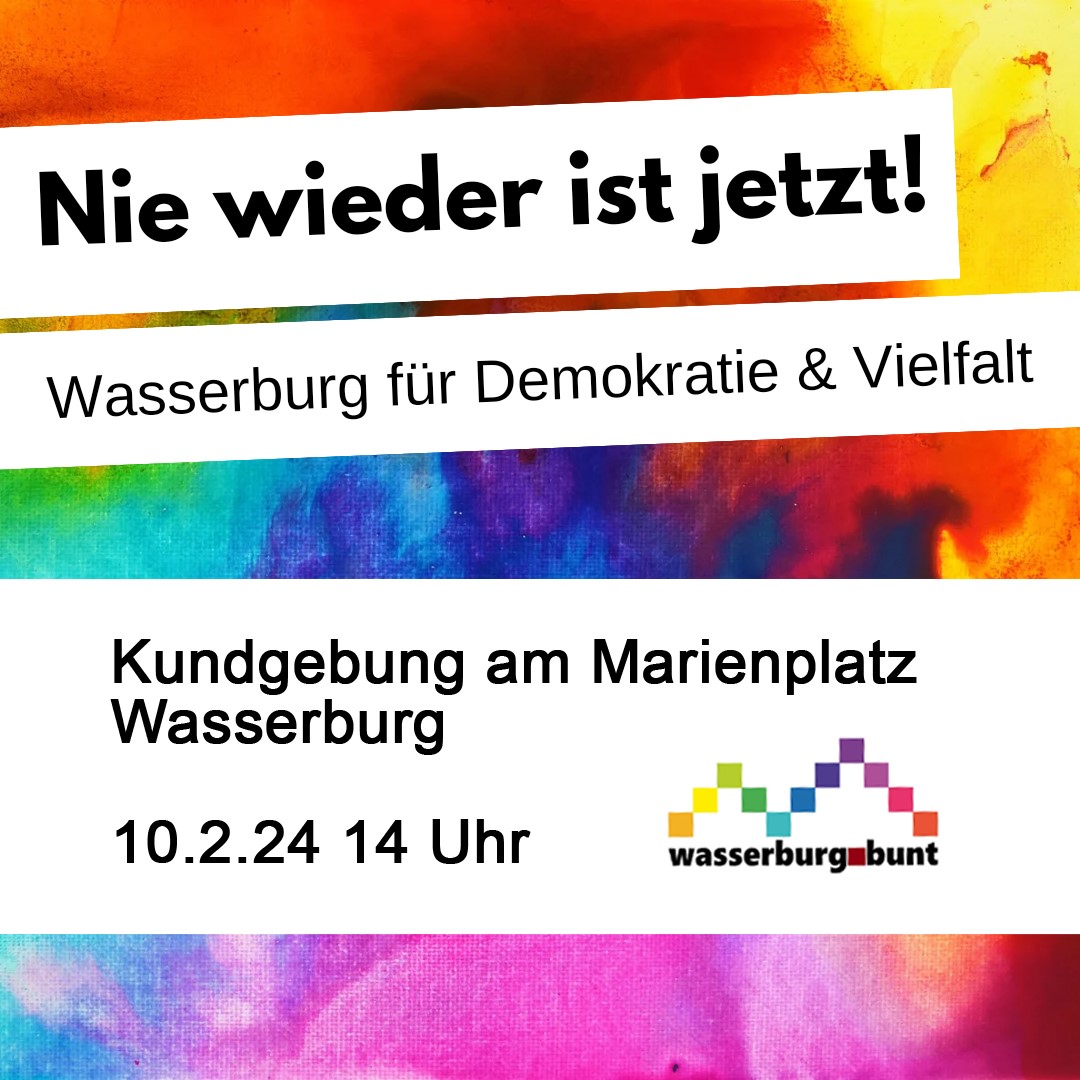 Bereits im Jahr 2017 hat sich das Bündnis „wasserburg.bunt“ zusammengeschlossen, um partei-übergreifend sowie mit Vereinen und Verbänden ein Zeichen für Toleranz und Demokratie zu setzen und Gesicht zu zeigen – für Menschlichkeit und ein friedliches Miteinander in Wasserburg.