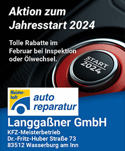 PR – Tolle Rabatt bei allen Inspektionen und Ölwechseln gibt es auf Standartinspektionsteile wie Luft-, Innenraum- oder Ölfilter beim Kfz-Meisterbetrieb Langgaßner in Wasserburg noch den ganzen Februar. Die Aktion ist verlängert. Die Rabatte gelten für die der Hersteller Bosch, TRW, Mahle. Einfach mal bei Langgaßner im Burgerfeld (Dr.-Fritz-Huber-Straße 73) vorbeischauen und bei der Anmeldung den Aktionscode „FebAct“ nennen. Oder gleich telefonisch einen Termin vereinbaren: 0 80 71 / 92 16 61.