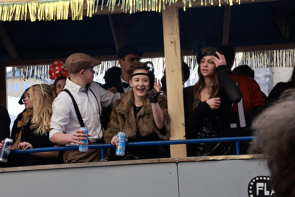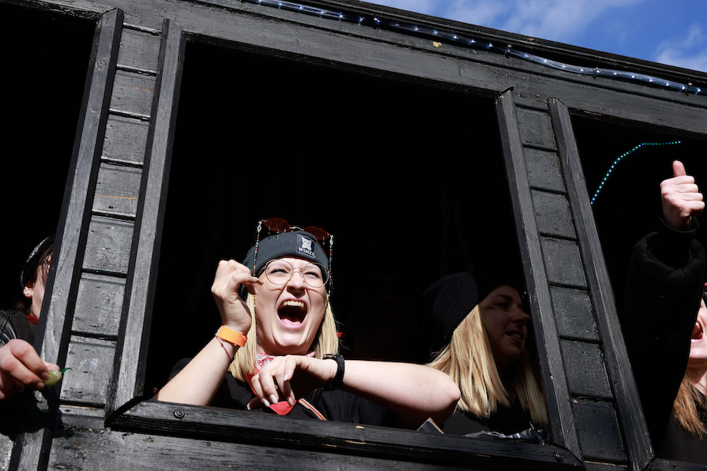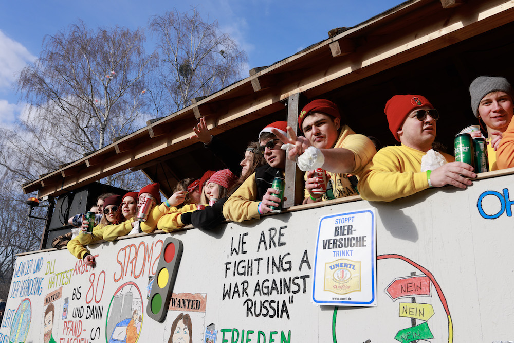 Viele Faschingswagen auf der Zugstrecke und tausende Besucher am Straßenrand