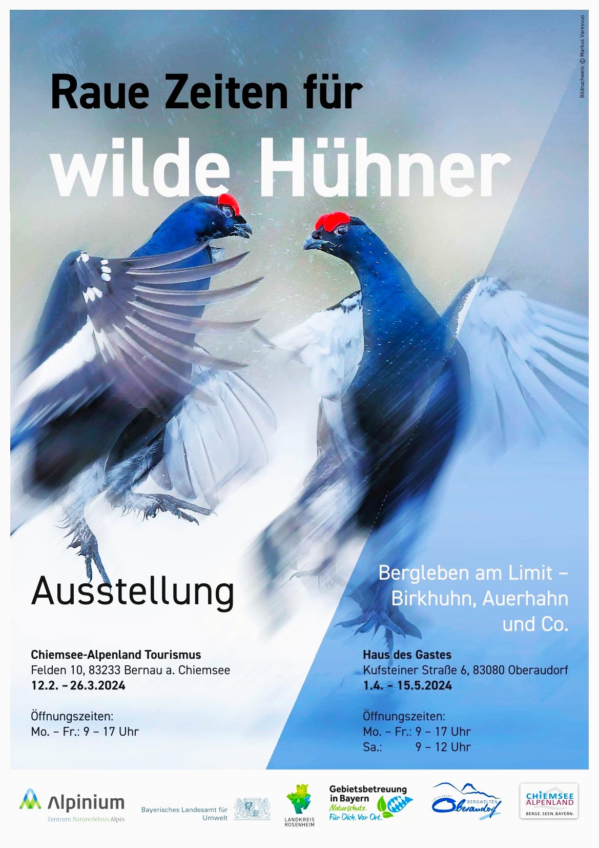Die vier im bayerischen Alpenraum heimischen Raufuß-Hühner sind wahre Spezialisten ihres Lebensraums und kommen auch mit extremen Bedingungen gut zurecht – trotzdem sind das Schnee-, Birk-, Hasel- und Auerhuhn bei uns nur noch selten anzutreffen. Die Gebietsbetreuung der Rosenheimer Alpen und der Chiemsee-Alpenland Tourismus zeigen deshalb bis Dienstag, 26. März, nun die – vom Bayerischen Landesamt für Umwelt, Alpinium und Nationalpark Hohe Tauern konzipierte – Wanderausstellung „Raue Zeiten für wilde Hühner – Bergleben am Limit – Birkhuhn, Auerhahn und Co.“ in den Räumen der Chiemsee-Alpenland Tourismus in Bernau am Chiemsee. Anschließend ist die Ausstellung für weitere sechs Wochen im Haus des Gastes in Oberaudorf zu sehen.