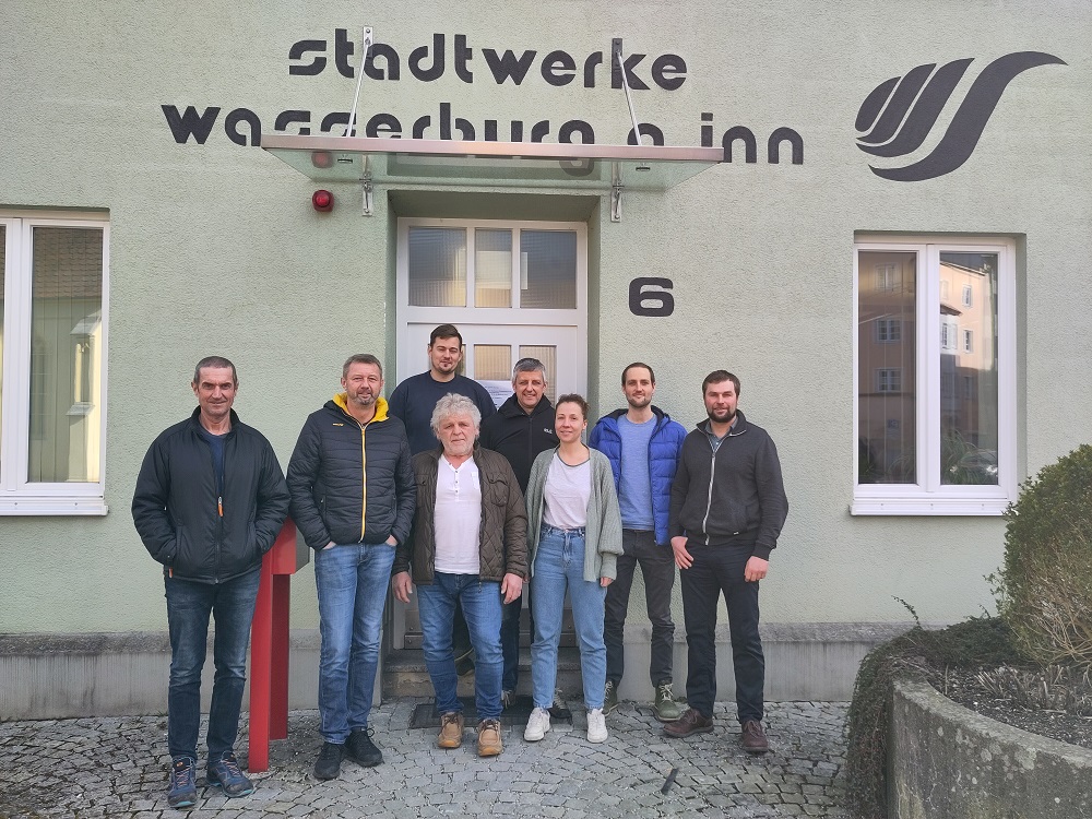 Foto (von links): Betriebsleiter Wasserwerk Josef Mayer, Stellvertreter Thomas Bernhart und Michael Andraschko von den Stadtwerken, Landwirte Heinrich Maier und Josef Sonnenholzner, Franziska Kerger und Philipp Maier (Ecozept, Freising), Landwirt Martin Huber.