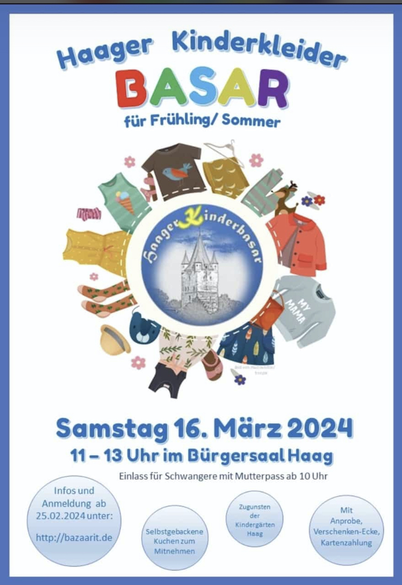 Am 16. März findet von 11 bis 13 Uhr wieder der Haager Frühjahrs-Kinderbasar im Bürgersaal in Haag statt. Schwangere (mit Mutterpass) dürfen mit einer Begleitung von 10 bis 11 Uhr vorab rein. Verkauft werden Frühjahrs- und Sommerbekleidung bis Größe 176, Spielzeug, Bücher, Kinderfahrzeuge aller Art, Kinderwagen, Babyausstattungen, Schuhe und vieles mehr.