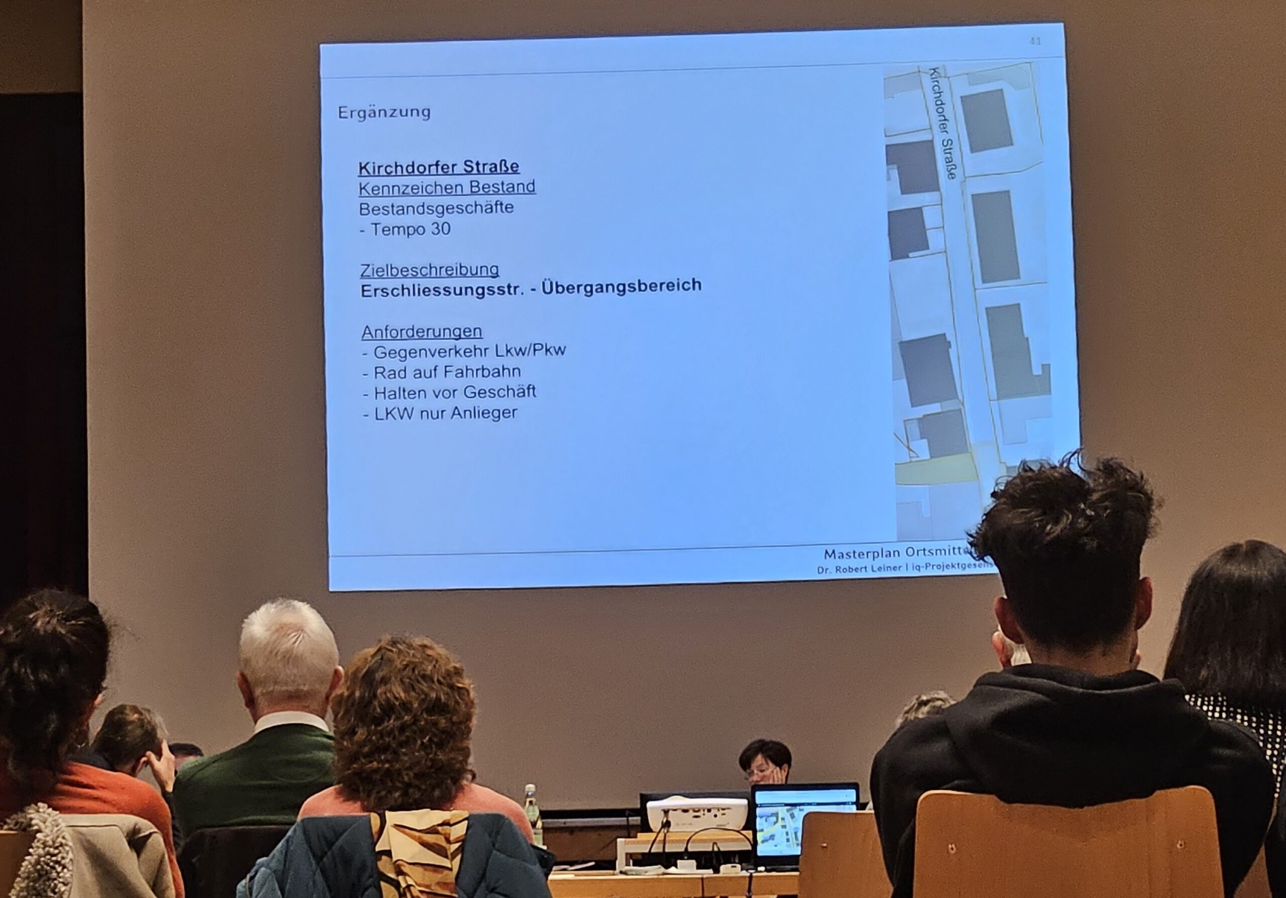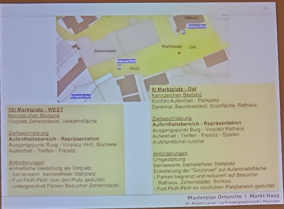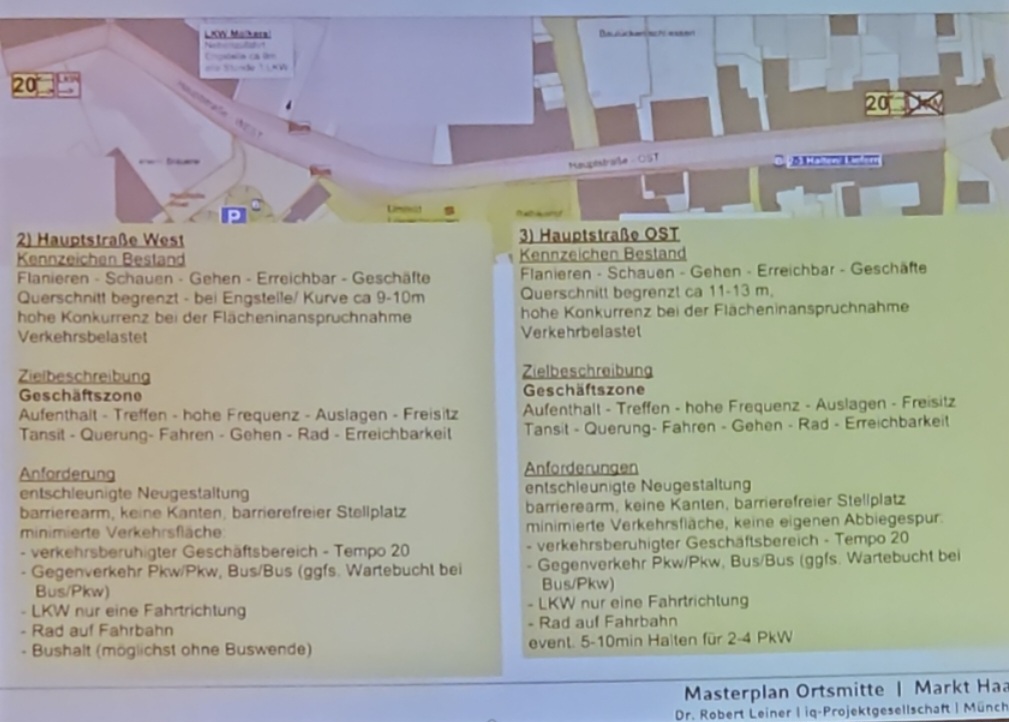 Für die Stadtplaner Rainer Heinz und Dr. Robert Leiner wurde es zur Aufgabe, verschiedene Ortsfleckchen mit Optimierungs-Ansätzen zu versehen. Im Grundsatz stand fest: Die Ortsmitte ist multifunktionaler, wohltuender und identitätsstiftender Raum. Sie ist Versorgungsstandort, Treffpunkt und Aufenthaltsort, Ort der Begegnung und Kommunikation und hat die örtliche Funktion als „gemeinsames Wohnzimmer“ für die Bürgerinnen und Bürger. Vom ursprünglichen Gedanken, den Bräuhausplatz etwas zu „beruhigen“ und hier anstatt des ortsmittigem Kurzzeitparkens eine Art Treffpunkt anzusteuern (so sah es lange die ISEK-Empfehlung vor) wurde über Board geworfen. Vielmehr wurde erkannt, dass die Bereiche zwischen Rathaus und Löwenbrunnen mehr Aufenthaltszentrum sein könnten. An der Rute wären Parkplätze machbar, doch hier und auch andernorts könne nicht mit vollumfänglicher Fläche geplant werden, da die Eigentumsverhältnisse teils privat seien. Die Hauptstraße und die Wasserburger Straße sowie die Münchener Straße – überhaupt – die gesamte Ortsdurchfahrt wurden im Masterplan ebenso behandelt, wie die Tatsache, dass man sich uneinig sei, wie das Verkehrsgutachten mit Verkehrszählung zu bewerten sei. Die Experten zeigten sich überzeugt davon, dass es positiv gelingen könne, die Durchfahrt für Lastwagen etwas zu erschweren, um mehr Aufenthaltsqualität anzustreben. Einige Gemeinderäte allerdings hatten hierzu eine gegenteilige Meinung. Für die Hauptstraße sei es nach Ansicht von Klaus Breitreiner wichtig, endlich eine Verbesserung und eine Sanierung der Straße anzugehen. Es sei schon längst überfällig, die Straßenverhältnisse zu optimieren.