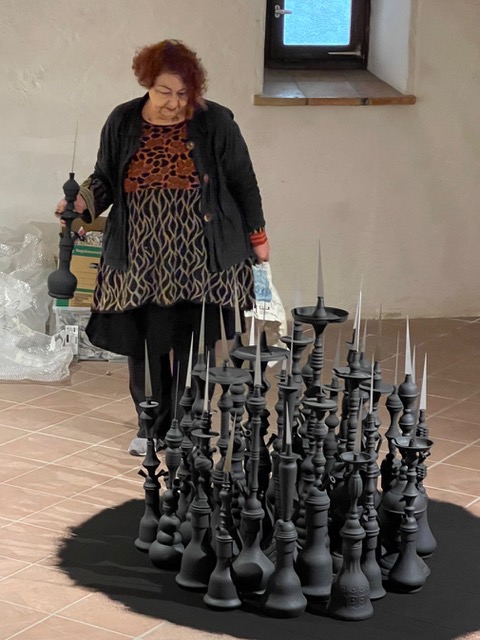 Seit einigen Tagen sind die Aufbauarbeiten für die Ausstellung bereits in vollem Gange: Im Kellergewölbe, im Ergeschoss und im ersten Obergeschoss werden die Werke von Adidal Abou-Chamat zu sehen sein. Im zweiten Obergeschoss und im Dachgeschoss des Ganserhauses kann man Arbeiten und Performances von Gülcan Turna sehen, außerdem wird Ingolf Hatz seine Kunstdokumentation „what’s cooking“ vorstellen. Diesmal hat er Josefine Pytkik in engeren Augenschein genommen.