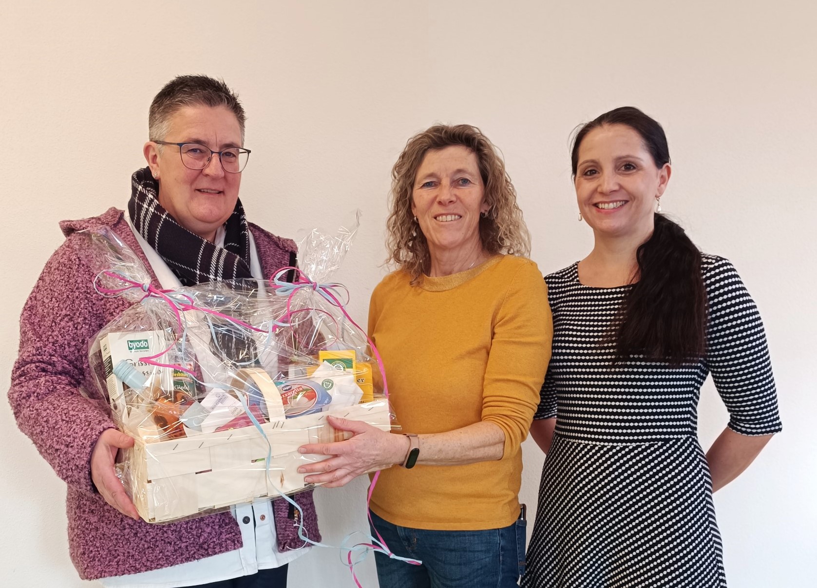 Elisabeth Huber (Bildmitte) kann auf 40 Jahre engagierte Kindergarten-Arbeit zurückblicken. Das war Anlass für das „Haus für Kinder Arche Noah“ in Haag, nun mit Frau Huber das besondere Dienstjubiläum zu feiern. Das Foto zeigt von links Verwaltungsleiterin des Kita-Verbunds Haag, Sabine Materna mit Elisabeth Huber sowie Kita-Leiterin Petra Wenhardt.