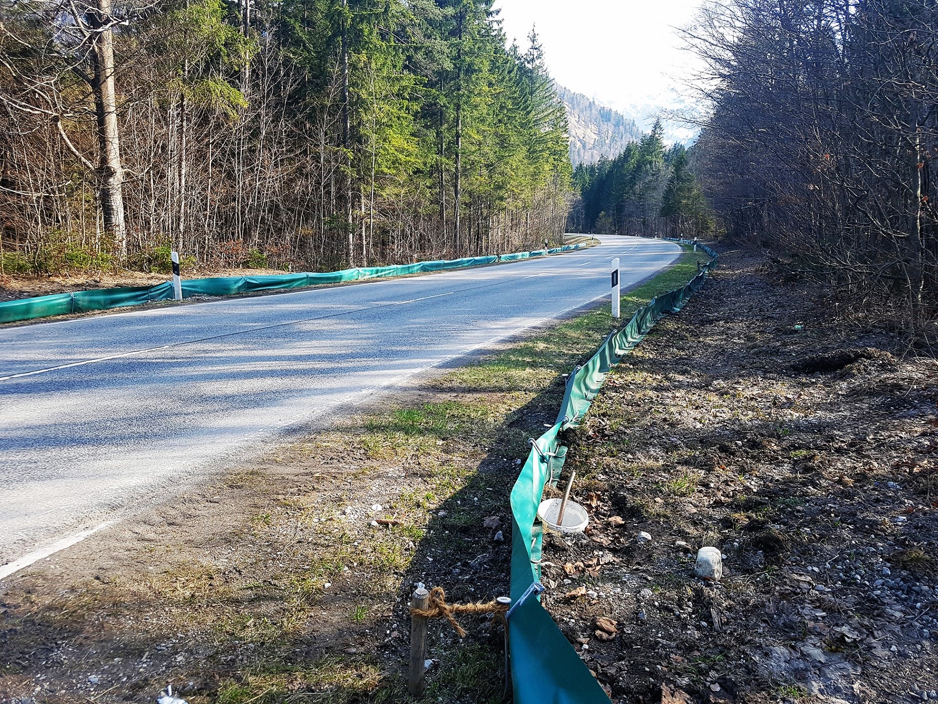 Entlang der Bundesstraßen und Staatsstraßen in den Landkreisen Rosenheim, Ebersberg, Miesbach und Mühldorf wurden deshalb schon jetzt mobile Amphibienschutzzäune aufgestellt und Eimer eingegraben- Überall dort, wo es entlang der Strecken keine stationären Schutzeinrichtungen gibt, die die Tiere beim Queren schützen …