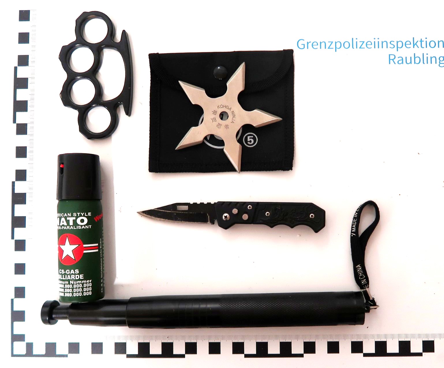 Im Rucksack des Mannes und somit griffbereit, fanden die Beamten einen Schlagring, einen Wurfstern, einen Teleskop-Schlagstock, ein Einhandmesser und ein CS-Gas-Spray, dessen Prüfzeichen vermutlich gefälscht ist – siehe Polizeifoto.