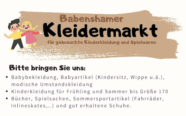 Weitere Informationen und Liste mit Etikettenvordruck auf www.babensham.de unter der Rubrik Babensham „Erleben / Kleidermarkt oder Aktuelles“. Der Erlös wird an soziale Projekte gespendet. Bitte unbedingt Parkhinweise beachten und Parkverbote beachten. Es gibt keine Verkäufernummern mehr. Adresse: Pfarrer-Gaigl-Straße 2, Babensham.