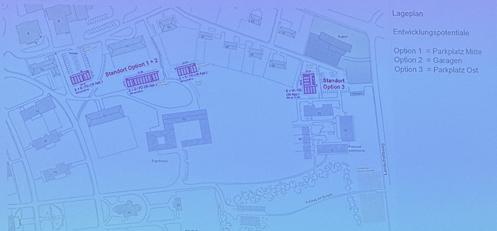 Auf dem Parkplatz (Variante 3), der von Besuchern und Bewohnern genutzt wird, ist dann auch wieder kein zusätzlicher Parkplatz da. Und dort ein sieben-stöckiges Gebäude? Schöne Aussichten!