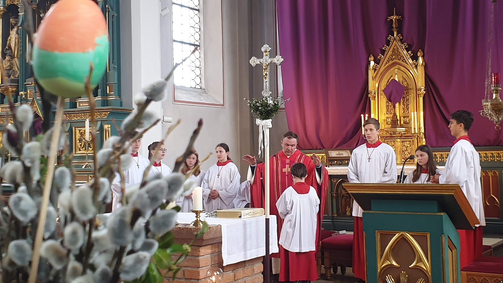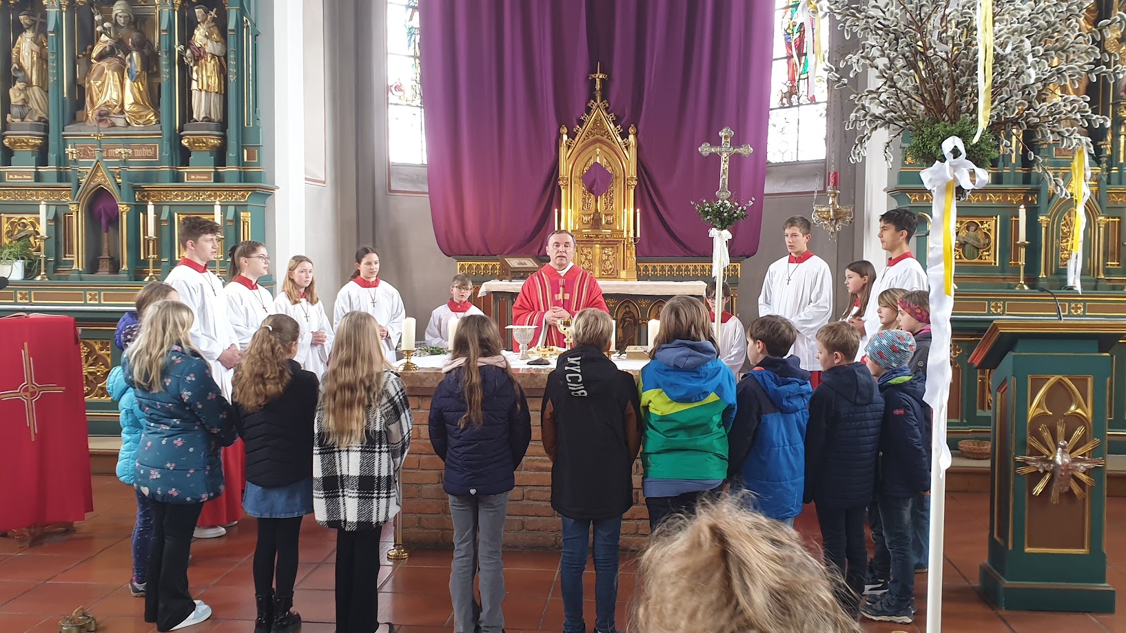 Zusammen mit vielen Gläubigen, darunter auch viele Kinder, feierte Pfarrer Pawel Idkoviak die Heilige Messe zum Palmsonntag, die nicht zuletzt durch die wie jedes Jahr lebendig vorgetragene Passion bestimmt wurde.