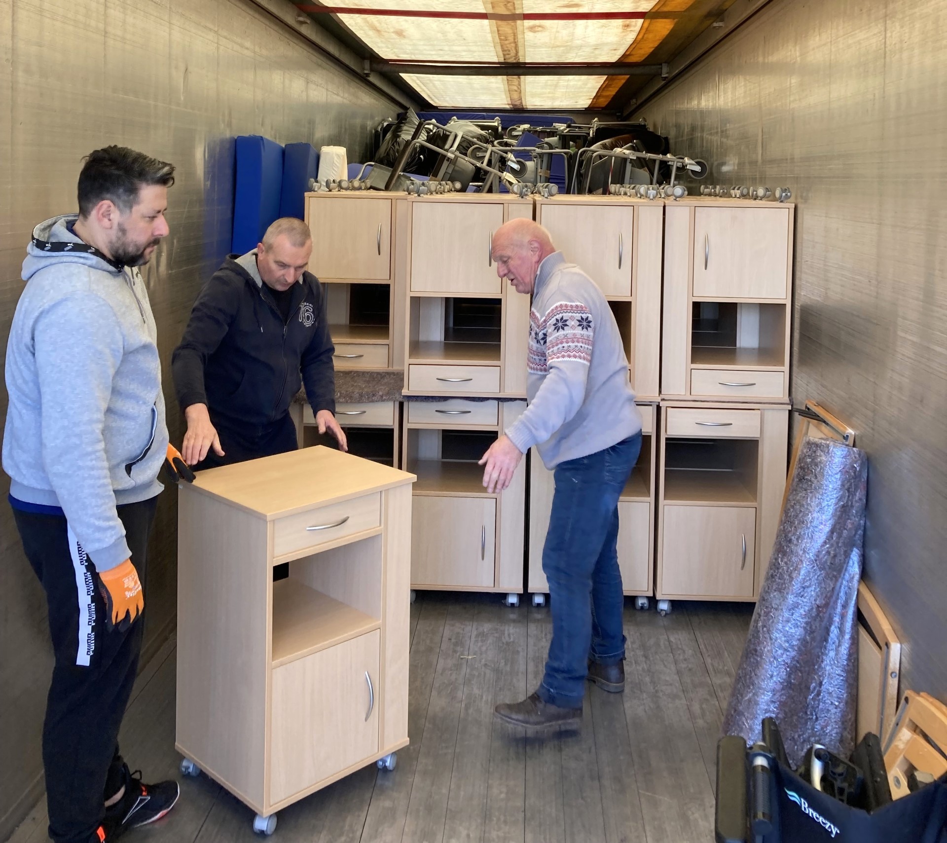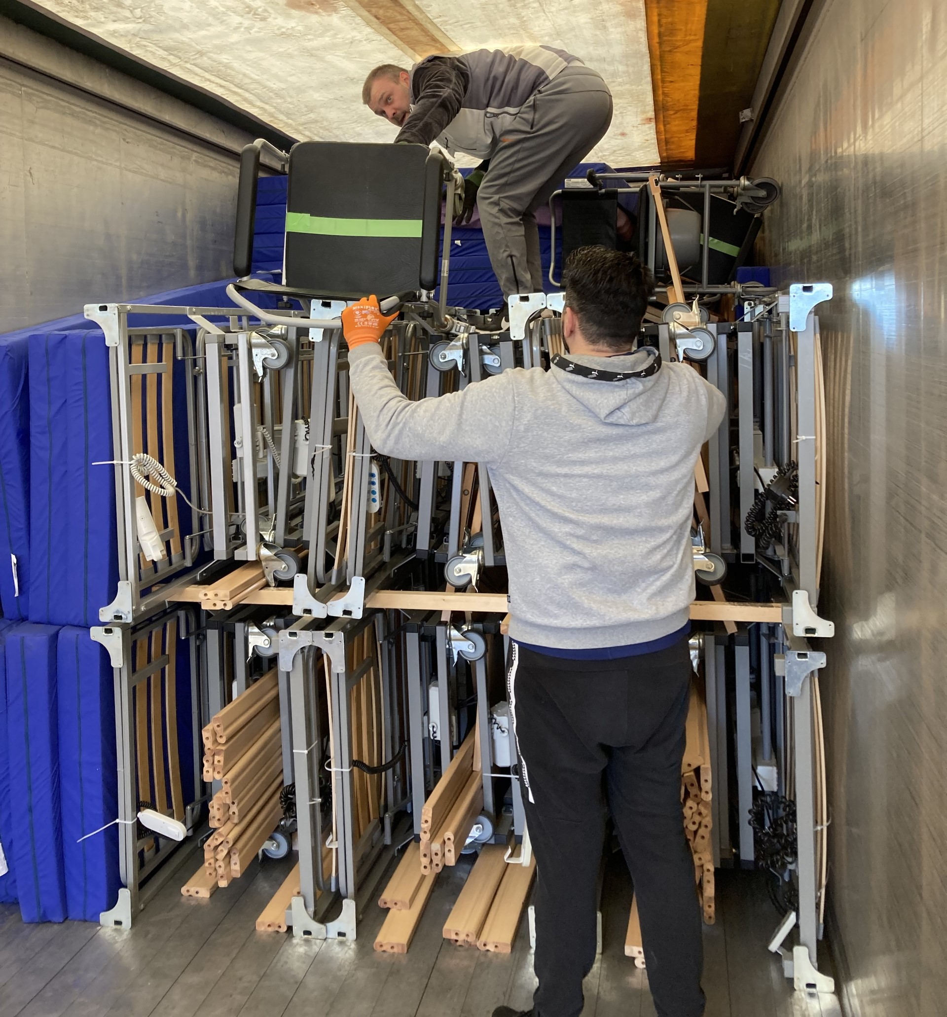 Und so wurden mehr als 30 Pflegebetten mit Nachtkästchen, Stühlen und Matratzen sowie Schränke, Rollatoren, Rollstühle, Toilettenstühle und Kleidung per Lkw direkt zur Klinik transportiert. Das Personal dort empfing die Beteiligten aus Deutschland sehr herzlich und half beim Entladen.