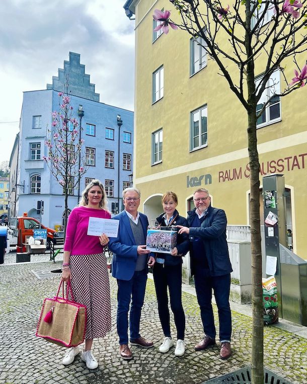 Der Wirtschafts-Förderungs-Verband der Stadt kam dem Wunsch vieler Bürger nach und stellte in der Backstube Deliano in der Hofstatt eine Spendenbox auf, um Spenden für eine Neuanschaffung zu sammeln. Insgesamt kamen 500 Euro zusammen. Das Innkaufhaus legte aus seiner Aktion „Bäume statt Böller“ (wir berichteten) 1.000 Euro drauf, der Obst- und Gartenbauverein nochmals 250. Die Gesamtsumme wurde gestern an Bürgermeister Michael Kölbl übergeben. „Reicht nicht ganz, aber für den Rest kommt natürlich die Stadt auf. Uns war klar, dass an diese Stelle so oder so wieder Magnolien hinmüssen“, sagte das Stadtoberhaupt, das sich bei Sibylle Gerer vom Innkaufhaus (links) sowie bei Christine Deliano und Christian Huber vom WFV für die Aktion bedankte.