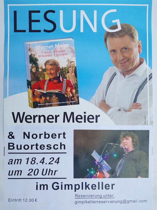 Werner Meier ist bekannt als Kabarettist und Liedermacher mit frechem Mundwerk und grooviger Gitarre. Der Meister des hintersinnigen Humors liest aus seinem Buch „7 Küah 8 Kinder 40 Knödel 1 Kanapee“. Dabei entführt er die Zuhörer mit herrlich-verqueren Geschichten in seine Bauernbubenzeit zwischen Kuhmist, Zinkbadewanne und dem Besuch eines japanischen Bischofs. Mal tiefgründig, mal verschmitzt und mal poetisch-leise, aber immer mit dem typisch meierischen Sprachwitz, so nimmt er sein Publikum mit zu einer Zeitreise in das bayerische Heimatdorf und auf den Bauernhof seiner Kindheit. Meiers Sprache ist so bilderstark, dass man gleich mittendrin und dabei ist.