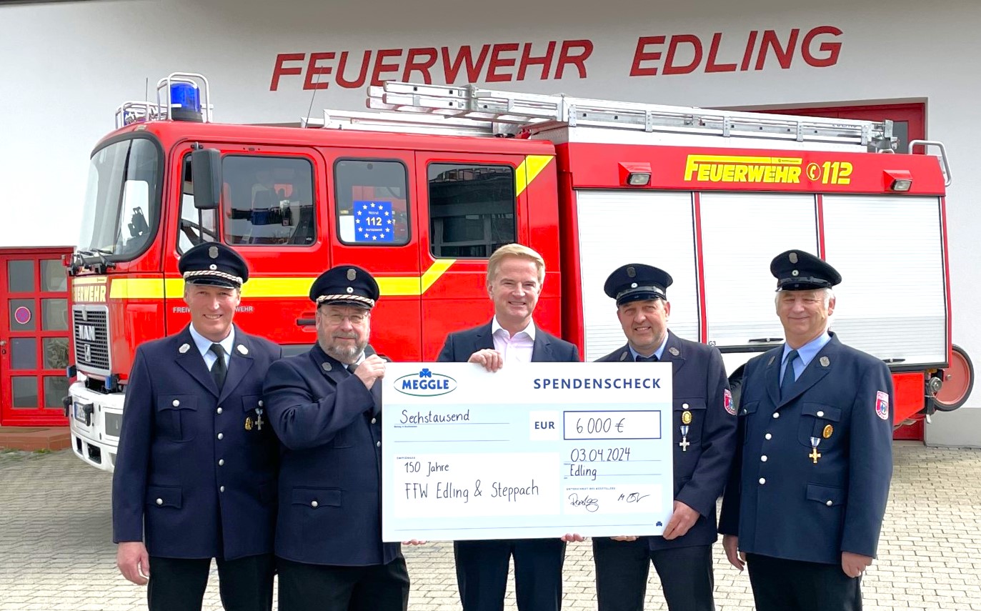 Eine großzügige Spende von der Firma MEGGLE: Anlässlich der bevorstehenden Feier zum 150-jährigen Jubiläum der Freiwilligen Feuerwehren Edling und Steppach unterstützt die MEGGLE-Gruppe die Floriansjünger mit insgesamt 6.000 Euro.