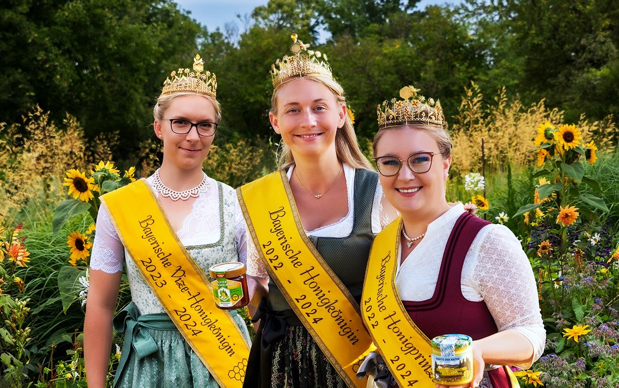Das sind die aktuellen Bayerischen Honig-Hoheiten 2022 bis 2024: Honigkönigin Victoria I. (Bildmitte) mit Vize-Honigkönigin Laura (links) und Honigprinzessin Linda (rechts). Jetzt suchen der Landesverband Bayerischer Imker e. V. und der Verband Bayerischer Bienenzüchter neue Bayerische Hoheiten. Denn im September werden die Ämter neu besetzt.