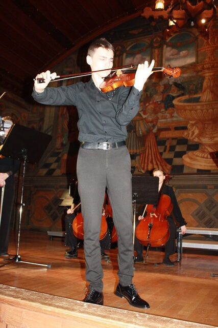 Die Nachwuchskünstler stellten sich selbst vor und spielten nach dem „Adagio und Fuga in c-moll für Streichorchester“ von Wolfgang Amadeus Mozart gleich Michael Haydns „Allegro con garbo“ aus dem Streichquintett in B-Dur. Michael Haydn war der jüngere Bruder des großen Joseph Haydn. „Allegro con garbo“, also mit Anstand und Würde gespielt, das ist den Musikern wirklich hervorragend gelungen. Besonders taten sich der aus der Ukraine stammende Denis Vasylynets mit seiner Violine gemeinsam mit Stylianos Mastrogiannis hervor. Man konnte sehr gut den Eindruck gewinnen, als ob die beiden Violinen sich miteinander unterhielten. Als dann Denis Vasylynets das „Poème für Solo Violine & Streicher“ von Ernest Chausson darbot, da war das Publikum förmlich verzückt. Mit sehr viel Verve verstand es Denis Vasylynets in äußerst beeindruckender Weise, mit anmutig klingenden piano-Passagen, abgelöst von opulentem Forte die Zuhörer förmlich in eine Sehnsuchtswelt der Spätromantik zu entführen. Dem Solisten und dem Orchester gelang es in herausragender Weise, das Publikum mit diesem Stück zu berühren und letztlich auch zu entführen.