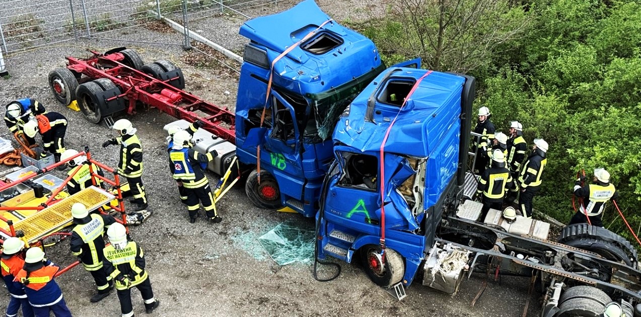 Zum Glück nur eine Übung: Zwei Lastwagen prallen auf einer Landstraße frontal zusammen, mehrere Personen sind in den Führerhäusern eingeklemmt. Dieses anspruchsvolle Szenario bewältigten die Feuerwehren aus Amerang, Bachmehring und Wasserburg jetzt im Rahmen einer Großübung auf dem Gelände der Recycling-Anlage in Schilchau.