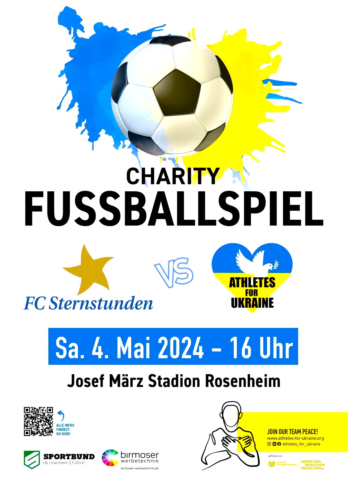 Es wird ein Benefiz-Highlight: Nächste Woche am Samstag, 4. Mai, findet um 16 Uhr ein Charity-Fußballspiel zwischen dem FC Sternstunden und dem Verein „Athletes for Ukraine“ im Josef-März-Stadion in Rosenheim statt. Eintritt und Getränke sind frei, um Spenden wird gebeten. Mitveranstalter ist der Sportbund Rosenheim.