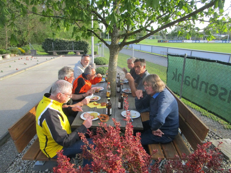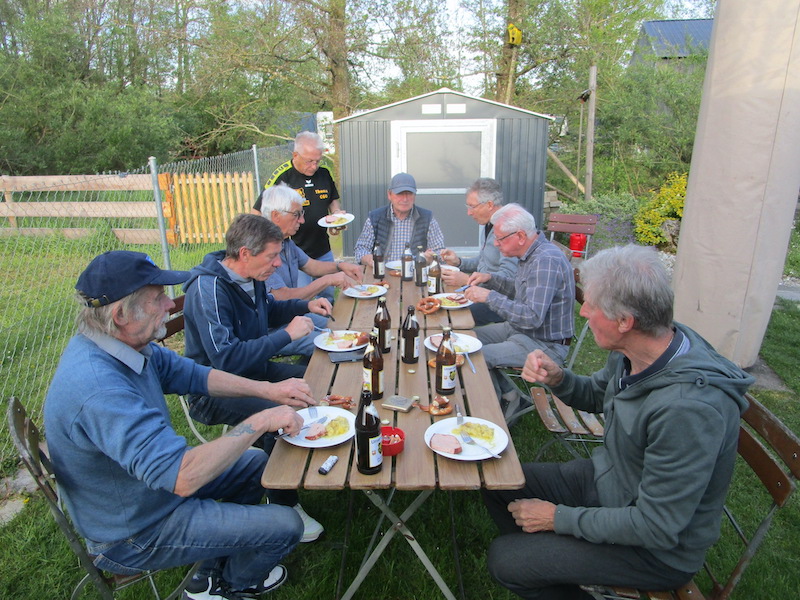 Nach der Siegerehrung durch Boccia-Chef Alois Blüml (links im Bild) tischten die „Vereinswirte“ Thomas Anzenberger und Alfred Rockinger einen frisch aufgebratenen Leberkäse aus der neuen Boccia-Küche und ein paar frische Siegerbierchen auf.