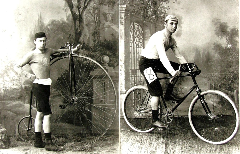 Zum Foto: Max Reheis in jungen Jahren mit Hochrad etwa um 1885 und als junger Rennfahrer auf dem Niederrad um 1890 …